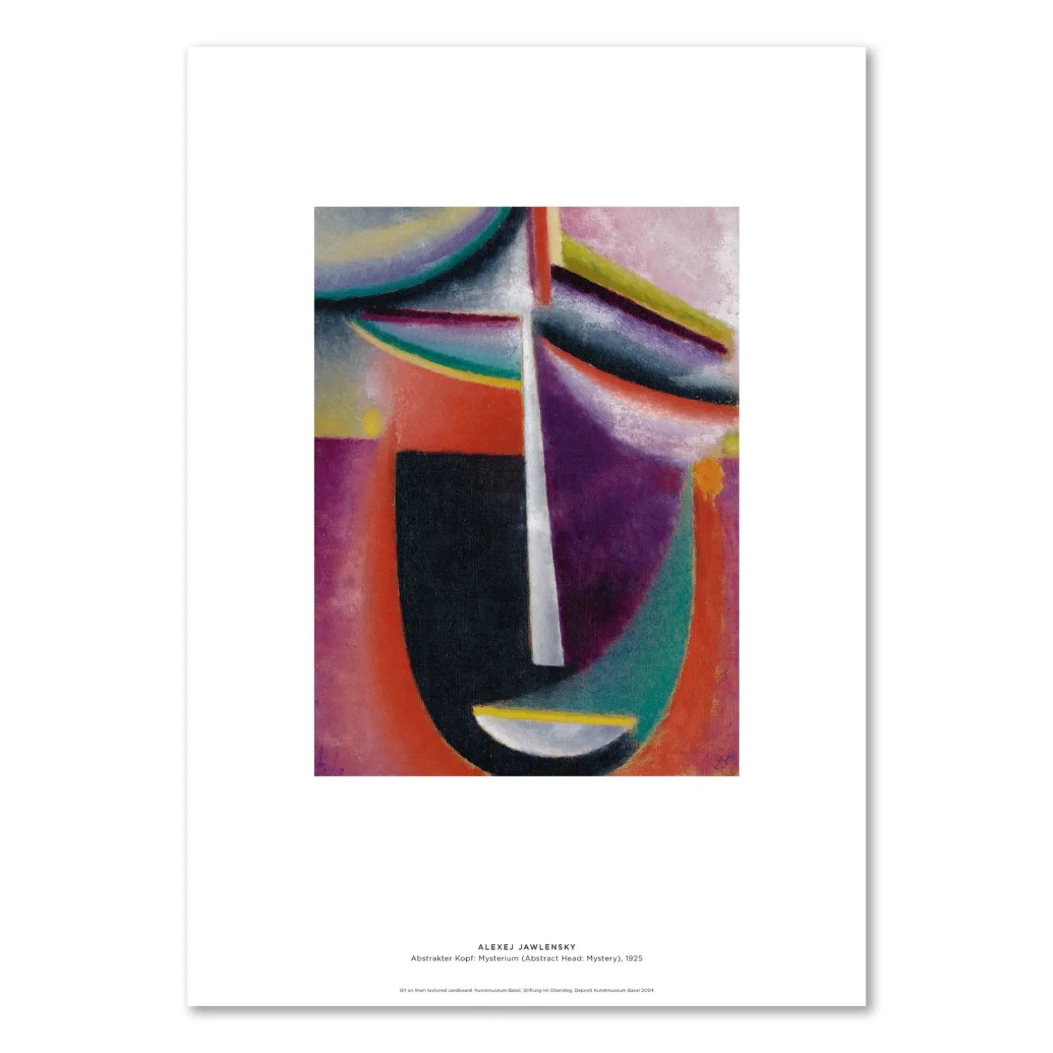 Louisiana print med værket Abstrakter Kopf Mysterium,1925, af maleren Alexej Jawlensky, udgivet i forbindelse med Louisianas udstilling 2025. I de sidste mere end tyve år af sit liv var det gentagelsen af motivet, der optog Jawlensky. Allerede i Schweiz, begyndte han at male ansigter serielt, og dette bliver hans primære projekt i disse år af hans liv og virke.