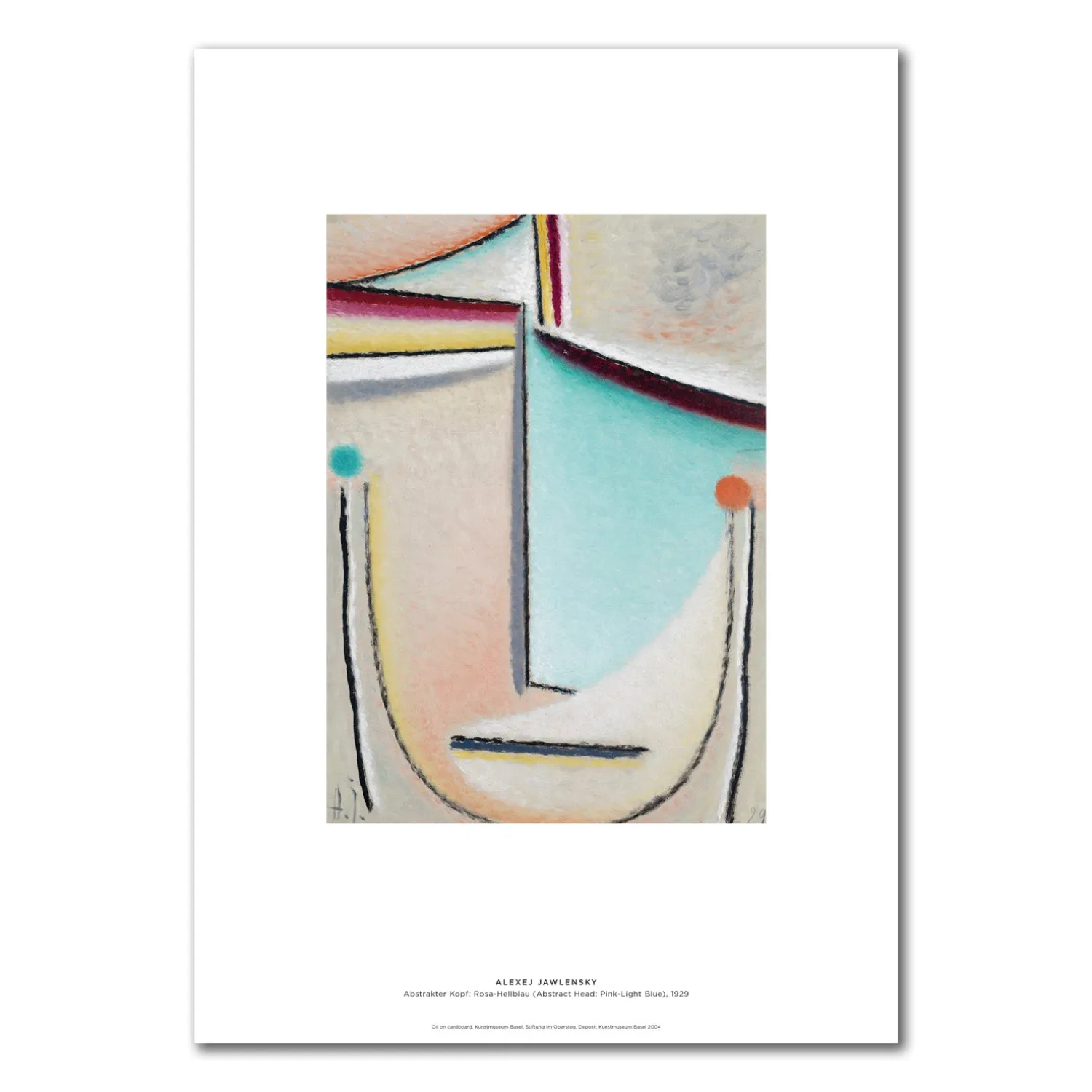 Louisiana print med værket Abstrakter Kopf Rosa-Hellblau, 1929, af maleren Alexej Jawlensky, udgivet i forbindelse med Louisianas udstilling 2025. I de sidste mere end tyve år af sit liv var det gentagelsen af motivet, der optog Jawlensky. Allerede i Schweiz, begyndte han at male ansigter serielt, og dette bliver hans primære projekt i disse år af hans liv og virke.