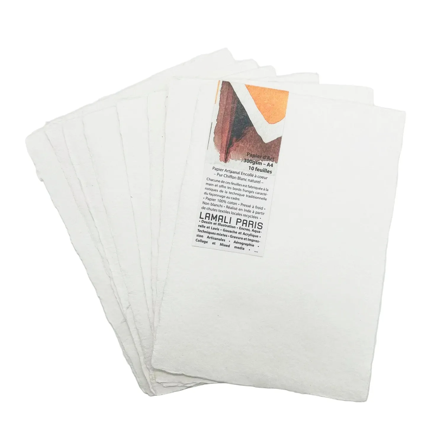Akvarelpapir i A4 størrelse fra det franske designbrand Lamali Paris. Hvert akvarelpapir er omhyggeligt håndlavet og har de karakteristiske frynsede kanter, som stammer fra den traditionelle rammefremstillingsteknik. Papiret er i 100% bomuld, koldpresset, ubleget og lavet i Indien af genbrugte lokale tekstilrester.