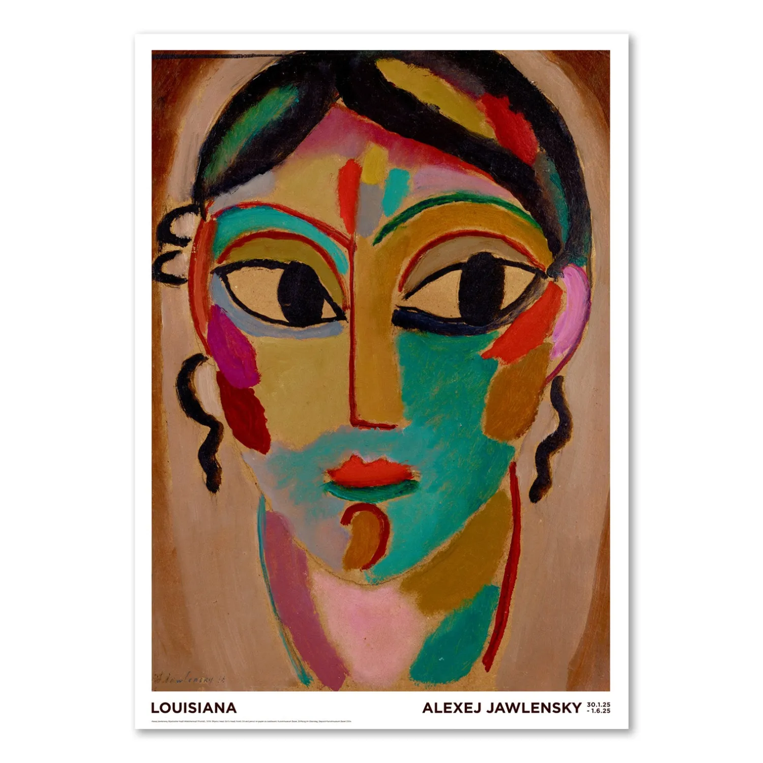 Plakat med værket Alexej Jawlensky, Mystischer Kopf: Mädchenkopf (frontal), 1918. Deposit Kunstmuseum Basel 2004, af maleren Alexej Jawlensky, udgivet i forbindelse med Louisianas udstilling i 2025. Det var i disse år, Jawlensky i stigende grad vendte sig motivmæssigt mod portrættet, som hos ham fik et farvestærkt, stiliseret udtryk, hvor særligt store øjne står frem som en dominerende faktor. Maleren Alexej Jawlensky (1864-1941) var en del af de europæiske avantgarde bevægelser i starten af 1900-tallet, men fandt egentlig først sin egen kunstneriske stemme sent i livet. Udstillingen viste Jawlenskys vej frem mod dette særegene udtryk, der har form af små, mystiske meditationer.