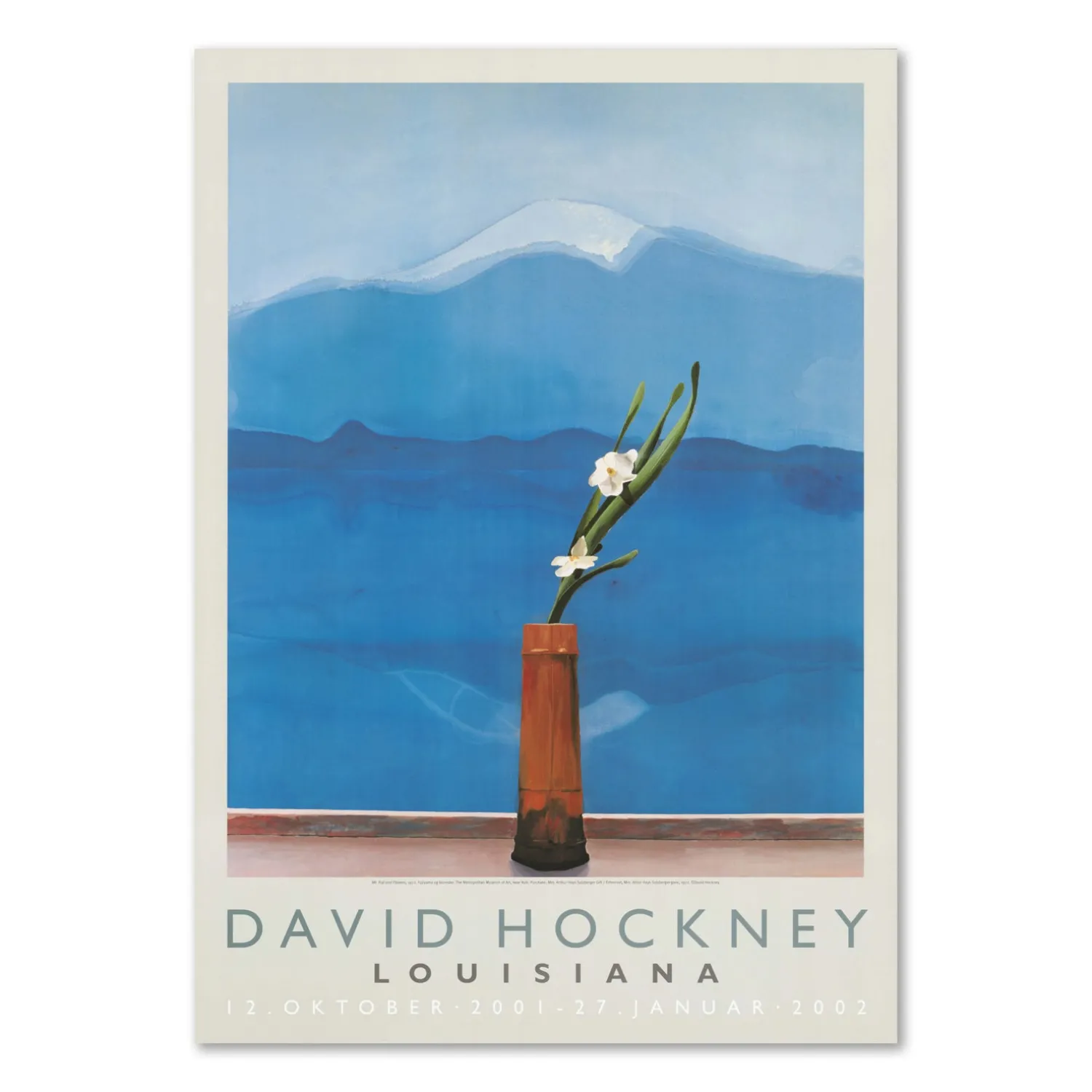 Louisiana plakat med værket, Mt. Fuji and flowers, (1972), udgivet i forbindelse med udstillingen, David Hockney – Maleri 1960-2000, på Louisiana i 2001-2002. David Hockney (f. 1937) er en af Storbritanniens mest indflydelsesrige kunstnere i det 20. århundrede og var central på 60’ernes pop-kunst scene i London. Han er særdeles velkendt blandt mange gæster på Louisiana, hvor han har udstillet flere gange.