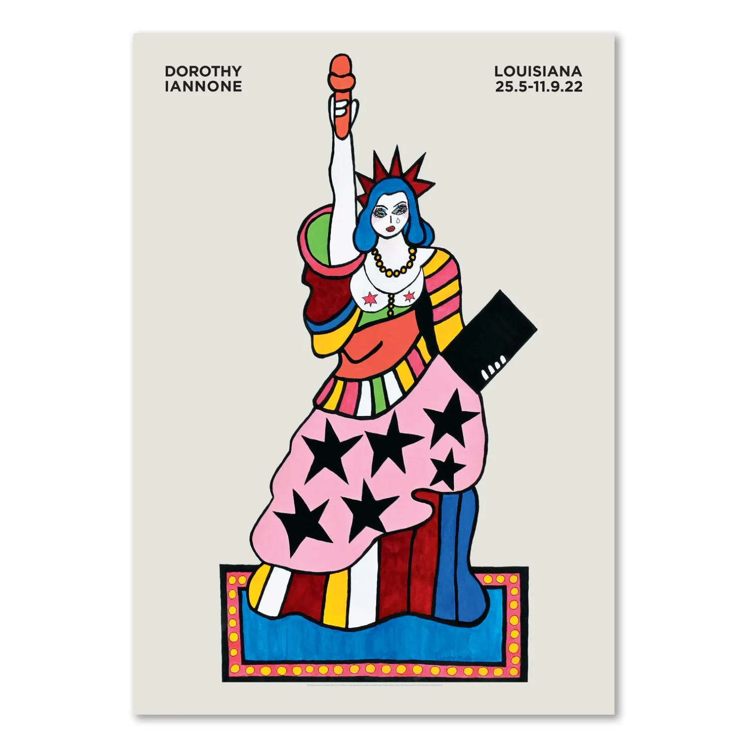 Louisiana plakat med værket, My Liberties – blue, (2019), af den amerikanske kunstner, Dorothy Iannone (f. 1933). Værket er en af tre frihedsgudinder, som Iannone skabte som et vægmaleri til parken, The High Line, i New York, hvor de var udstillet fra 2018-2020. Frihed, fri kærlighed og frigjort seksualitet er centrale temaer i Dorothy Iannones erotiske billeder. I 2022 præsenterer Louisiana et retrospektivt udvalg af Iannones værker, som en del af udstillingsserien, Louisiana on Paper.