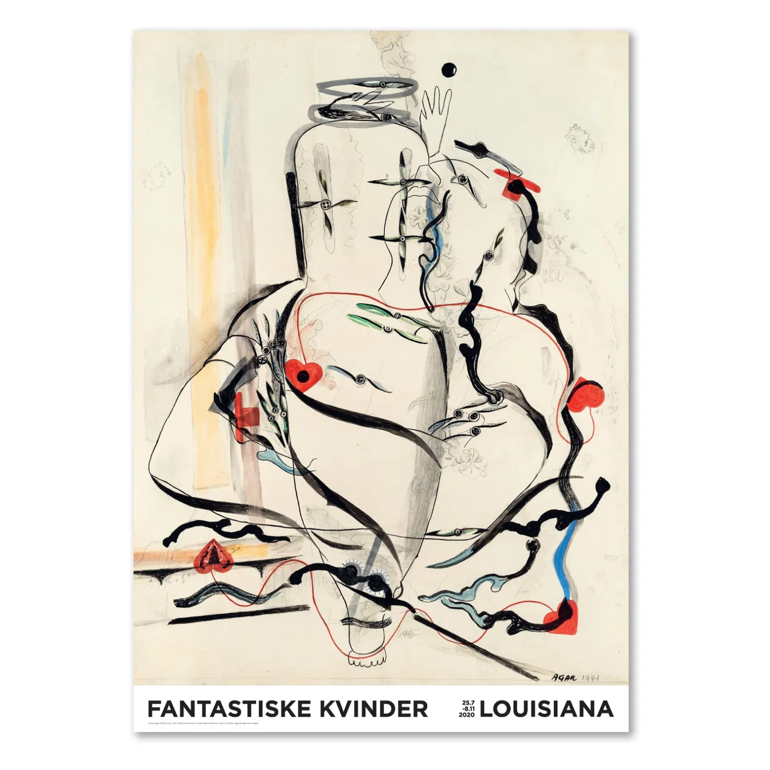 Udstillingsplakat med værket, Infinite Loop, (1941), af den argentinsk-engelske kunstner, Eileen Agar (1899 – 1991), udgivet i forbindelse med udstillingen, Fantastiske kvinder, på Louisiana i 2020. På anbefaling af Henry Moore, tilslutter Agar sig i 1933, The London Group, og har samme år sin første separatudstilling.