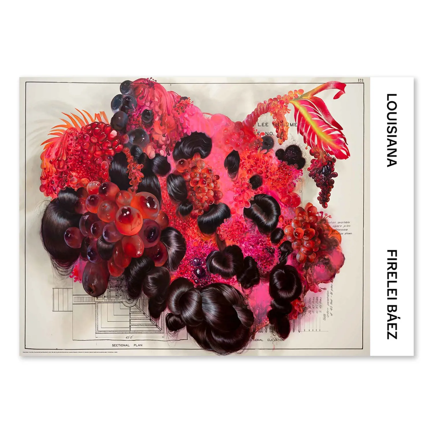 Louisiana Plakat med værket Fruta Fina af udgivet I forbindelse med Louisianas udstilling (2024) med den den dominikansk-amerikanske kunstner Firelei Báez (f. 1981) – hendes første soloudstilling i Europa. Monumentale malerier og installationer fulde af poesi, smerte og enorm skønhed konfronterer den vestlige verdens hegemoniske magtsprog. Gamle kort, arkitektoniske tegninger og bogsider er de håndgribelige og vitale udgangspunkter for hendes malerier.