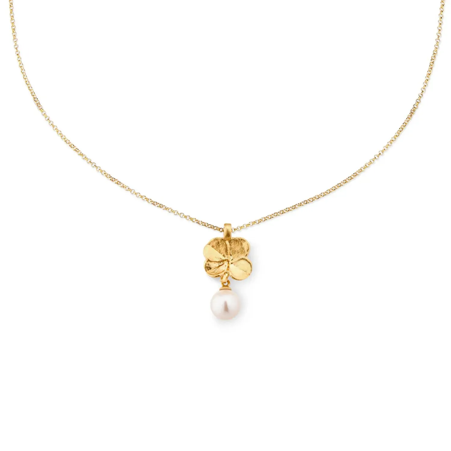 Vedhæng og kæde er udført i det fineste 100% genanvendte sterlingsølv med 22 karat forgyldning. Firkløverets fine detaljer er vel bevaret, og perlen tilfører et ekstra strejf af eksklusivitet.