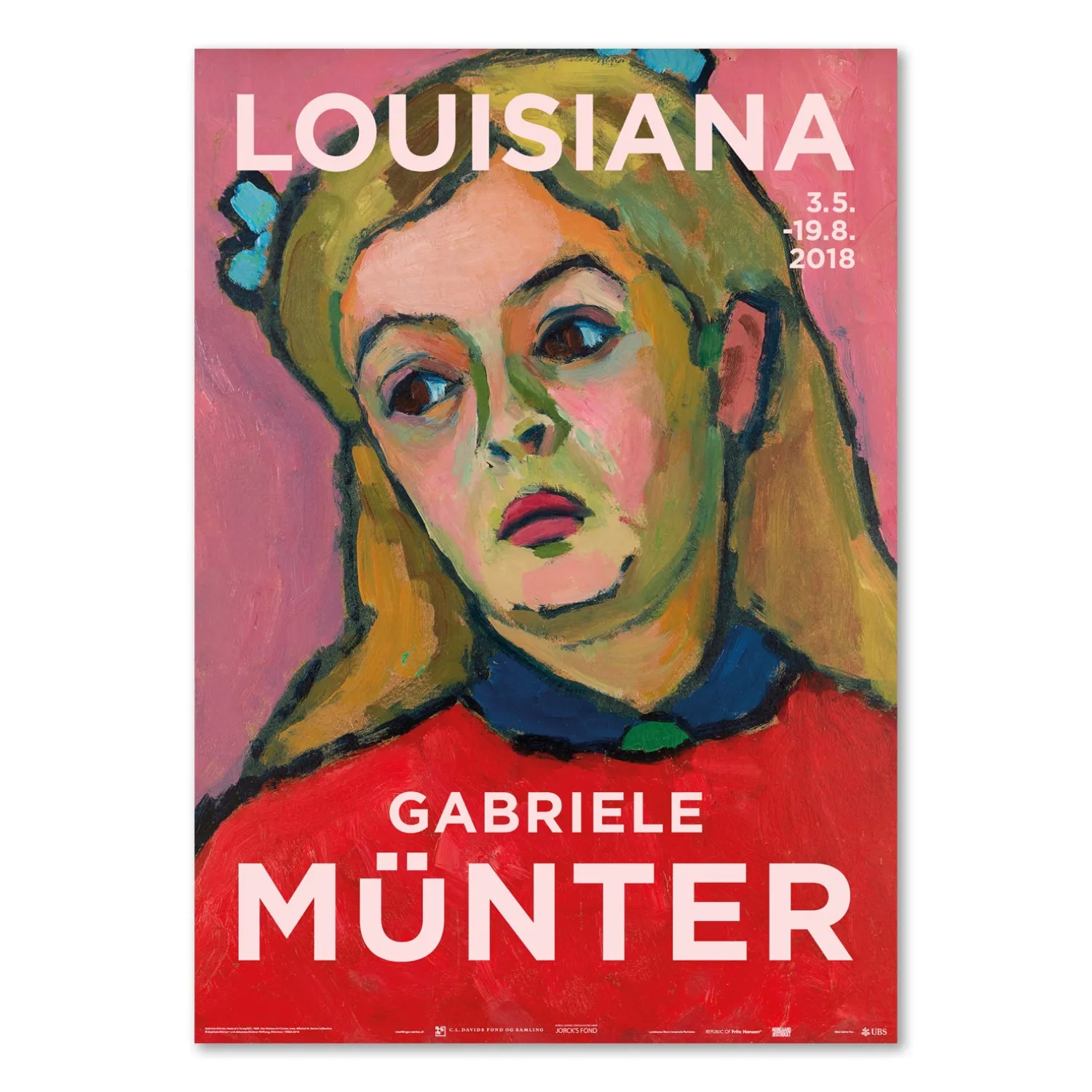 Udstillingsplakat med værket, Mädchenbildnis – Portræt af en ung pige, (1908), af den tyske kunstner, Gabriele Münter (1877-1962). Plakaten blev udgivet i forbindelse med Louisianas udstilling i 2018 med Gabriele Münter, en af de vigtigste tyske impressionister.