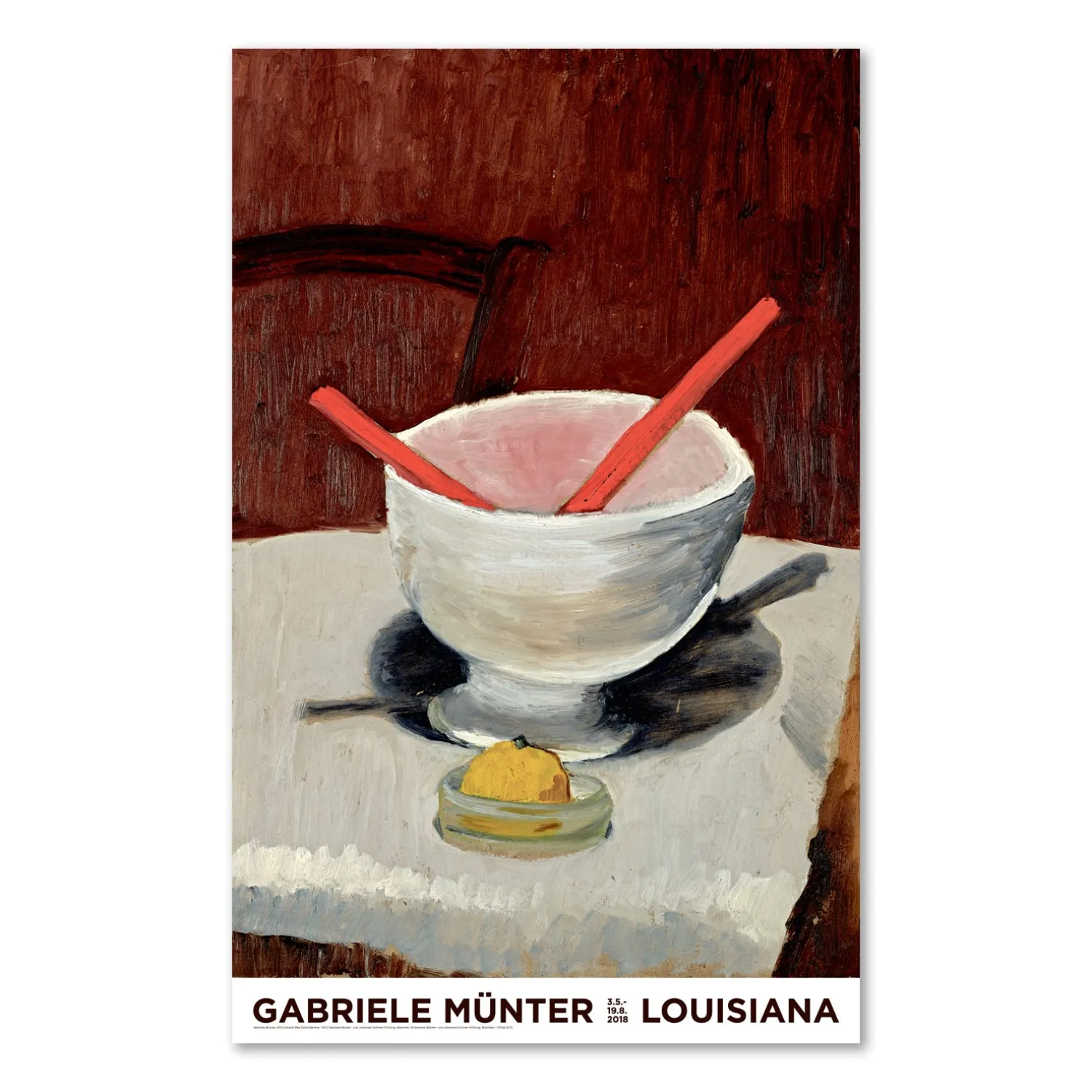 Louisiana udstillingsplakat med værket, Stilleben mit rotem besteck, Opstilling med rødt bestik, (1930), af den tyske kunstner, Gabriele Münter (1877-1962). Plakaten blev udgivet i forbindelse med Louisianas udstilling i 2018 med Gabriele Münter, en af de vigtigste tyske impressionister.