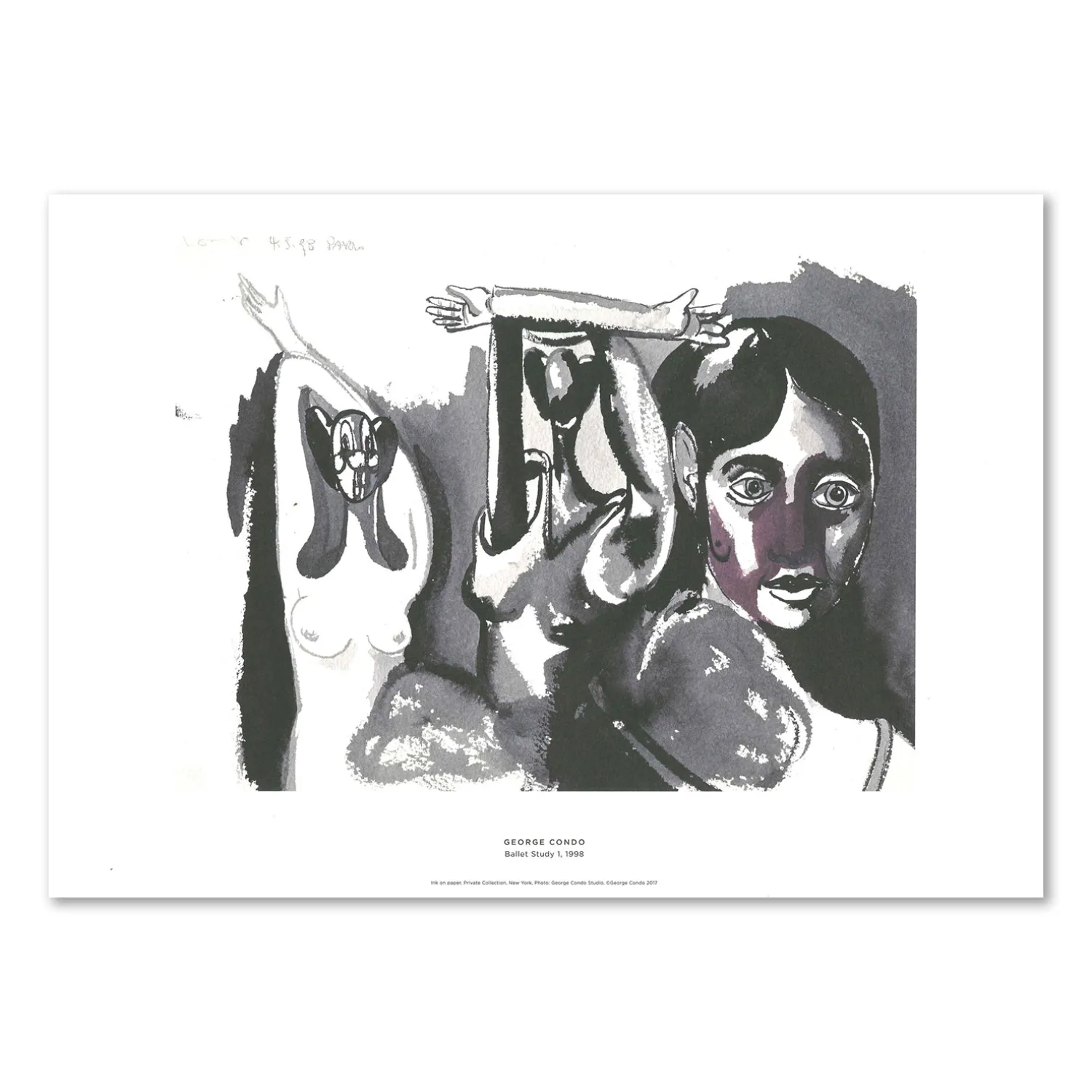 Louisiana print med værket, Ballet Study 1 (1998), af den amerikanske kunstner, George Gondo (f. 1957). I sit vidtspændende og ofte provokerende værk udvisker Condo grænserne mellem det komiske og tragiske, groteske og smukke, klassiske og nytænkende. Louisiana udstillede i 2017 en lang række af Condos værker på papir.