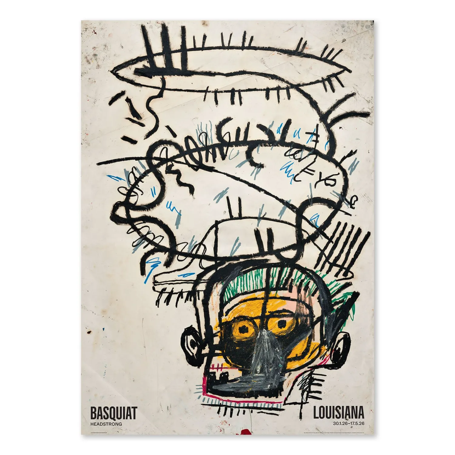Louisiana Plakat med værket, Head 1982-83, af den amerikanske kunstner Jean-Michel Basquiat (1960-1988), udgivet i forbindelse med udstillingen ‘Basquiat – Headstrong’. Dette er den første større udstilling, der fokuserer på Basquiats afbildninger af det menneskelige hoved – et felt, der står centralt i hans virke.