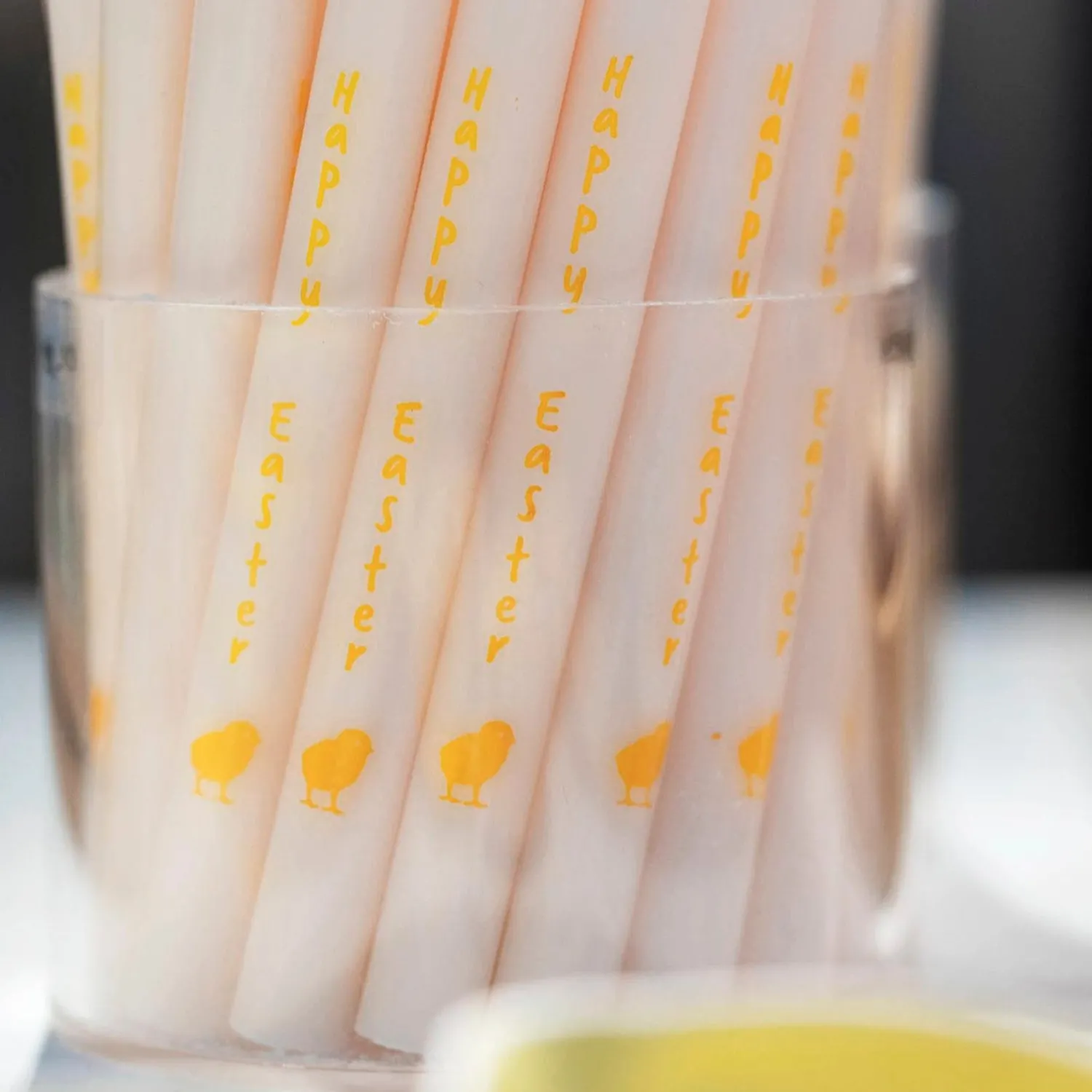 Kertelys med påsketekst og en lille, sød kylling – et festligt blikfang på påskebordet.