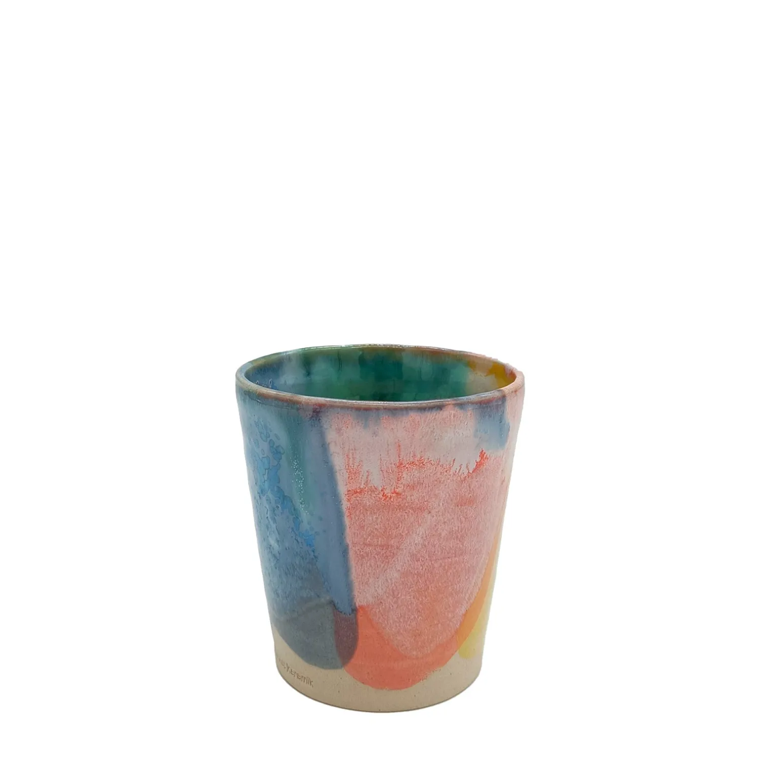 Kop i håndlavet stentøjskeramik fra Bergkvist Keramik på Møn. Formgivningen er enkelt og skabt efter dansk håndværkstradition ved drejeskive. Glasurarbejdet er eksperimenterende og farverig, inspireret af den mønske natur.