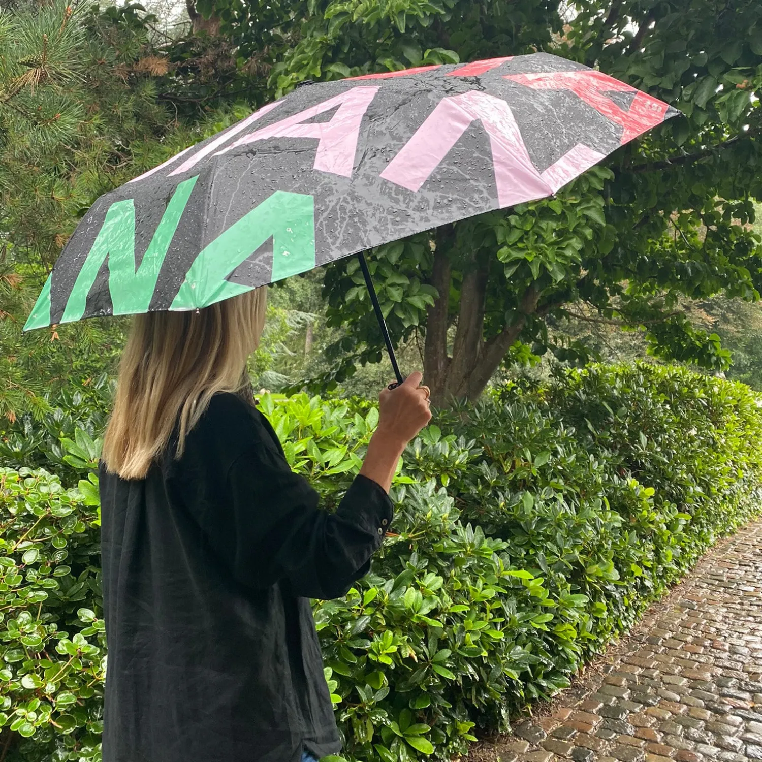 Klassisk paraply i sort og hvid med Louisiana logo. Det er dog kun af udseende at paraplyen er klassisk, for paraplyen skifter farve, når den bliver våd.