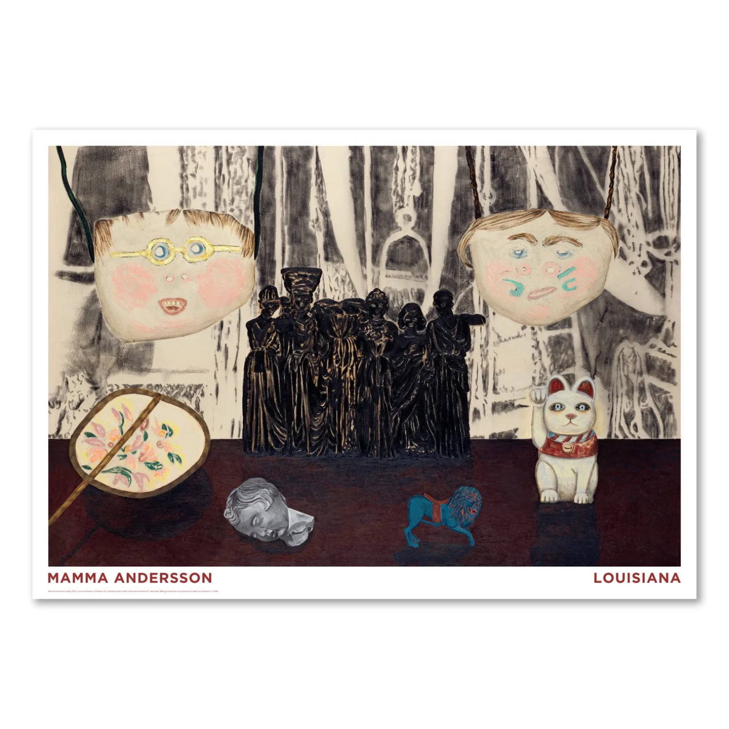 Louisiana Plakat med værket Adjö, 2020 med den svenske maler Mamma Andersson, udgivet i forbindelse med Louisiana udstillingen Parrhesia – værker fra samlingen i 2024. Teknisk kombinerer Mamma Andersson flere forskellige materialer i sine værker, og hendes særlige æstetik udspringer af gentagne bearbejdninger og overmalinger. Olie på lærred dækkes af spraymaling, malingen trækkes i tynde bånd henover overfladen, og hermed opstår en materiel fylde og variation, som sætter håndværket i centrum.