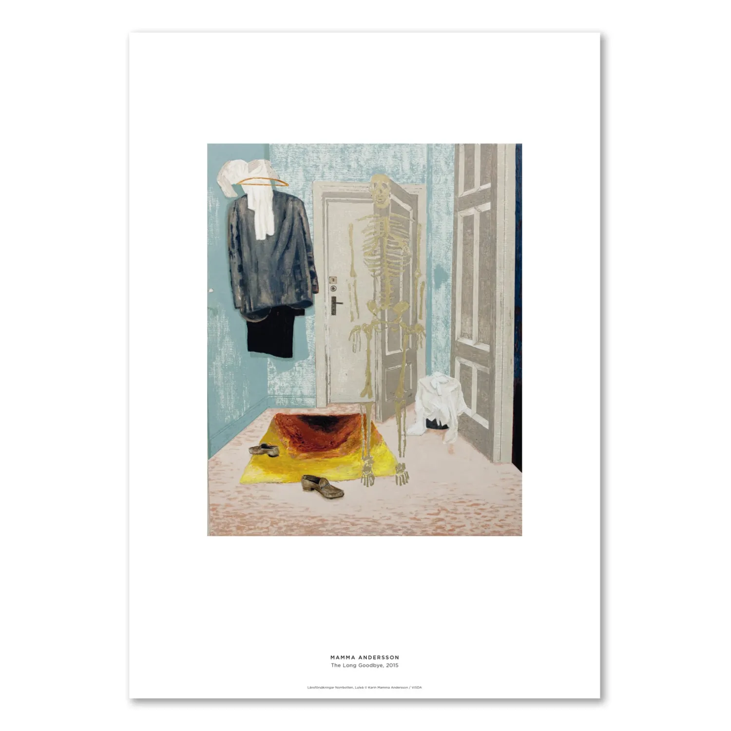 Mamma Andersson har mange landskaber og stillebens blandt sine værker – men bestemt også figurer. Ofte med en umeddelsom aura, mindre tilgængelig for vores projicerede forestillinger om, hvad figurenes historier kan tænkes at være. En figur kan også være halv-geometriske skulpturer, et tomt stykke beklædning, eller det, der ultimativt er tilbage af figuren, skelettet, som her i, The Long Goodbye (2015).
