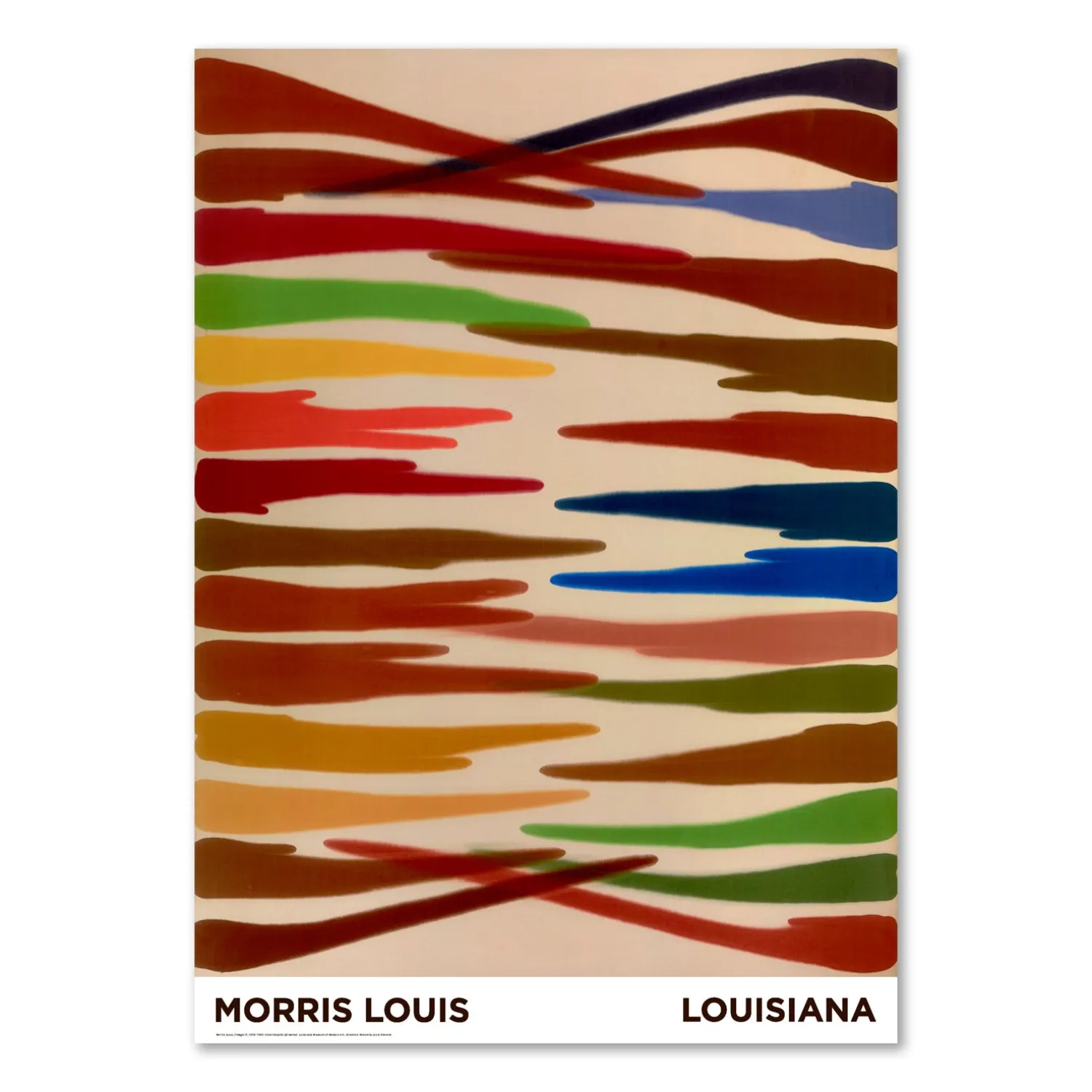 Louisiana plakat med værket, Omega IV, (1959-1960), af den amerikanske kunstner, Morris Louis, (1912-62). Morris Louis tilhørte den nye generation af colorfield-malere, der gjorde sig gældende i New York efter 2. Verdenskrig. Louisiana modtog dette værk – samt flere andre – som gave fra Louis’ enke, Marcella Louis Brenner, efter en udstilling på museet i 1975.