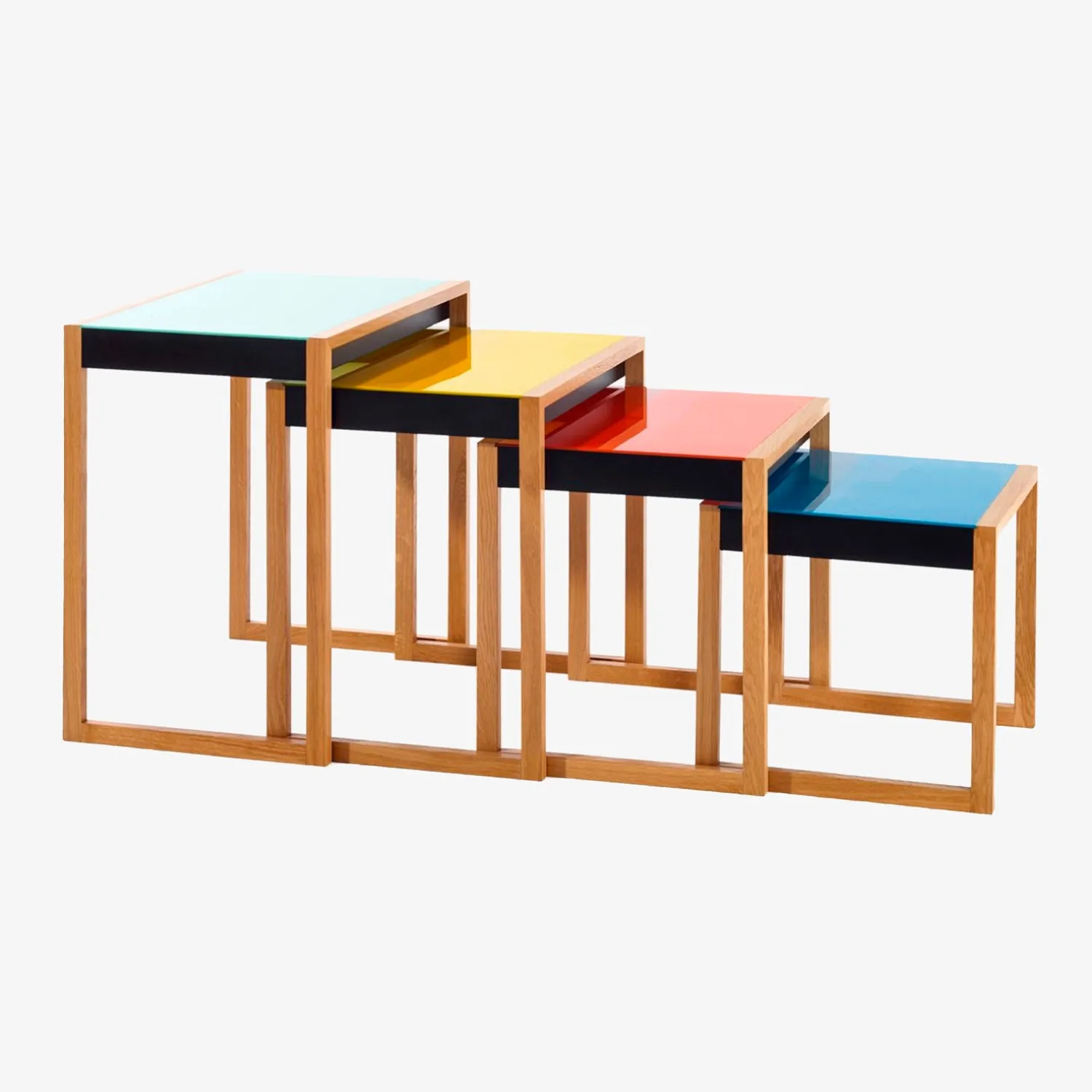 Nesting Tables – fire, farverige indskudsborde designet af den tysk-amerikanske kunstner, Josef Albers (1888-1976), i 1926. Det tidsløse bordsæt, der oprindeligt blev skabt til ejerne (og kunstnerens tætte venner) af Moellenhoff-Haus i Berlin, står i dag som en Bauhaus-klassiker.