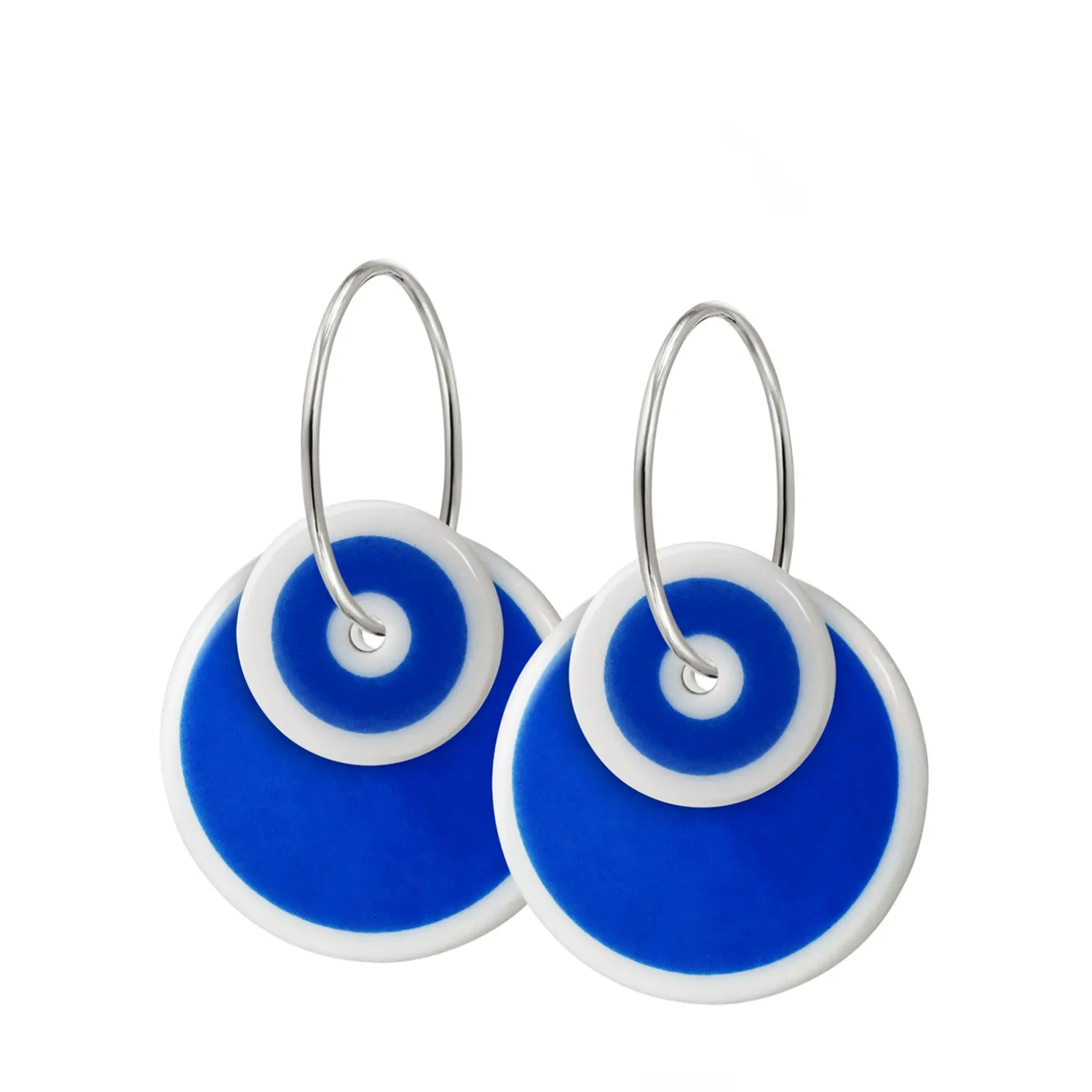 Øreringe, Halo Duo, i sterling sølv og håndlavet porcelæn fra det danske smykkebrand Scherning København. Øreringen er i dobbelt cirkelformet vedhæng af hvid porcelæn med dekoration i enten rød, blå eller grøn farve.
