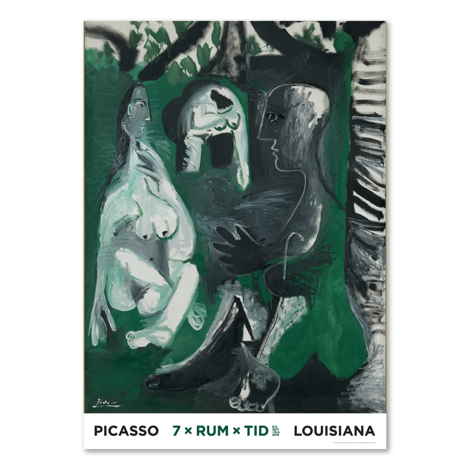 Louisiana plakat med værket, Le dejeuner sur L’herbe – Frokost i det grønne, (1961) af den spanske kunstner, Pablo Picasso, (1881-1973). Picasso portrætterer her sig selv som maleren og sin kone, Jaqueline, som modellen, mens et fabelvæsen af en pige spadserer rundt i dammen bagved, som en hilsen til Manet.
