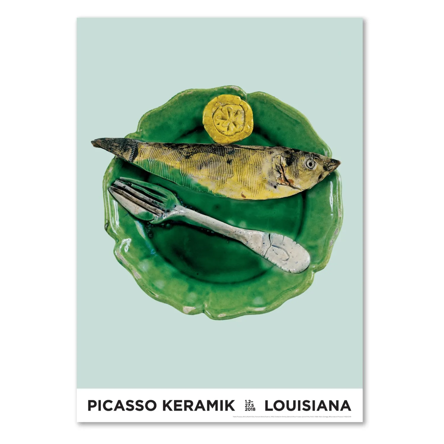 Louisiana plakat med værket, Still-life with Fish, Fork and Slice of Lemon, (1955), af den spanske kunstner, Pablo Picasso (1881-1973). Plakaten blev trykt i forbindelse med den store udstilling, Picasso Keramik, på Louisiana i foråret 2018, som markerede begyndelsen på Louisianas 60 års jubilæumsår.