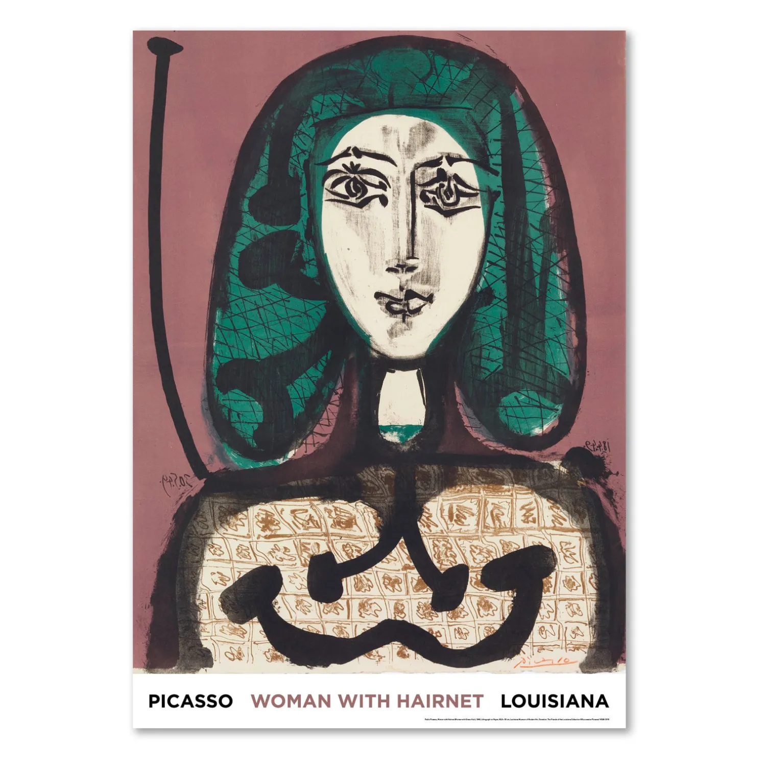 Louisiana plakat med værket, Woman with Hairnet, (1949), af den spanske kunstner, Pablo Picasso, (1881-1973). Louisiana har et særligt forhold til Picasso og dette smukke litografi fra 1949 er en del af Louisianas samling, som desuden tæller tre fornemme malerier samt tegninger og andre grafiske tryk af den ikoniske kunstner.
