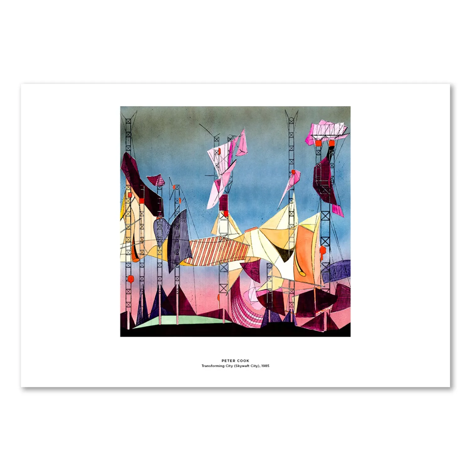 Louisiana print med værket, Transforming City, (1985), af arkitekt, Sir Peter Cook, fra udstillingen, City landscapes, på Louisiana. Peter Cook (f. 1936) har i seks årtier inspireret og præget både arkitektur og selve tænkningen om arkitekturens rolle med sine visionære ideer om nye by- og livsformer.