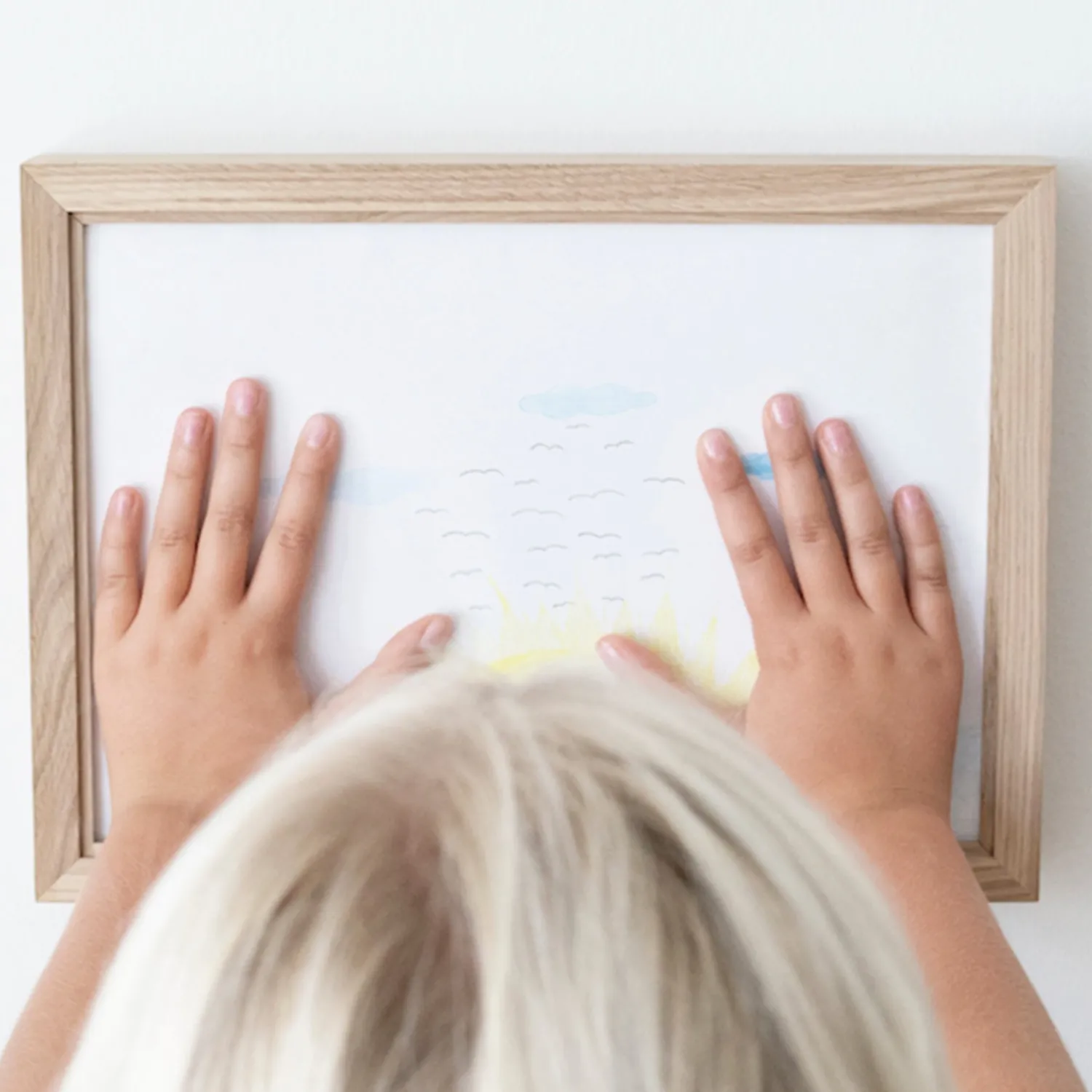 Svaret blev Ram’n. Den gedigne egetræsramme rummer op til 50 stykker papir ad gangen, og “udstillingen” kan derfor skifte udtryk lynhurtigt.
