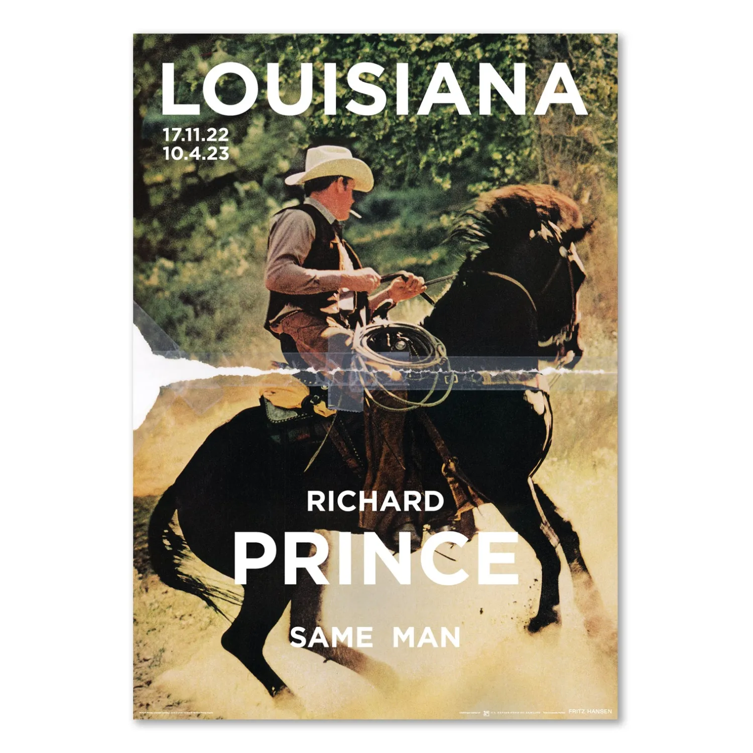 Udstillingsplakat med værket, Untitled (Cowboy), 2016, af den amerikanske kunstner, Richard Prince, som Louisiana fra november 2022 præsenterer på udstillingen, Same Man, i udstillingsserien, Louisiana on Paper. Richard Prince (f. 1949) er en hovedfigur i USA’s såkaldte, Picture Generation. Han genfotograferer de glittede magasiners reklamer med sofaer, fotomodeller, bikergirls – eller den amerikanske mand, sådan som cigaretmærket Marlboro har formuleret ham: Her tæt beskåret af Princes kamera, holdt sammen med tape, åbent for en ny fortolkning.
