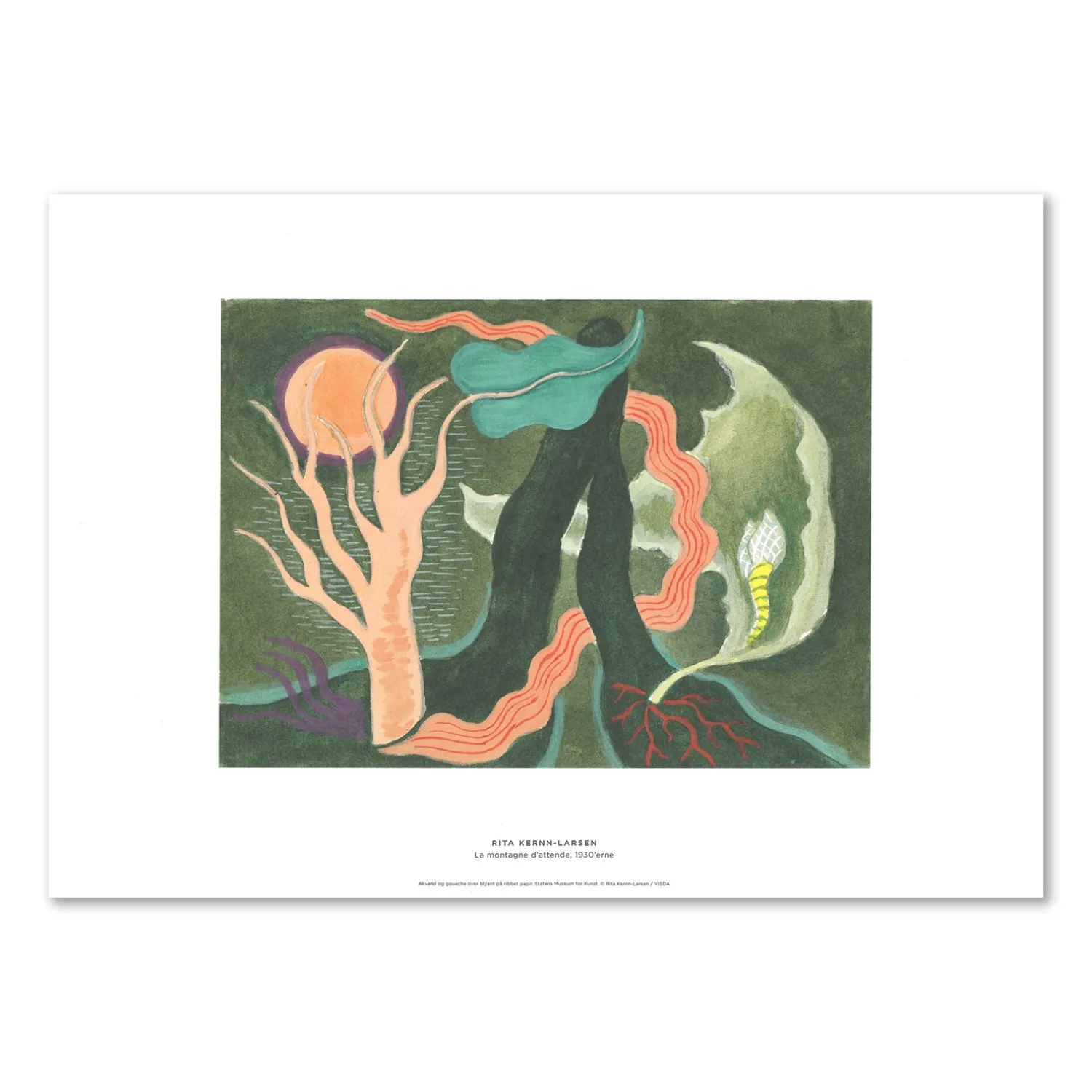 Louisiana print med værket, La montagne d’attende (1930’erne), af den danske, surrealistiske kunstner, Rita Kernn-Larsen (1904-1998). Kernn-Larsen er en international ener i dansk billedkunst. I Paris oplever hun tidligt i karrieren international anerkendelse og udstiller på nogle af tidens mest ombruste surrealisme-udstillinger side om side med kunstnere som Salvador Dali, Max Ernst og Meret Oppenheim.