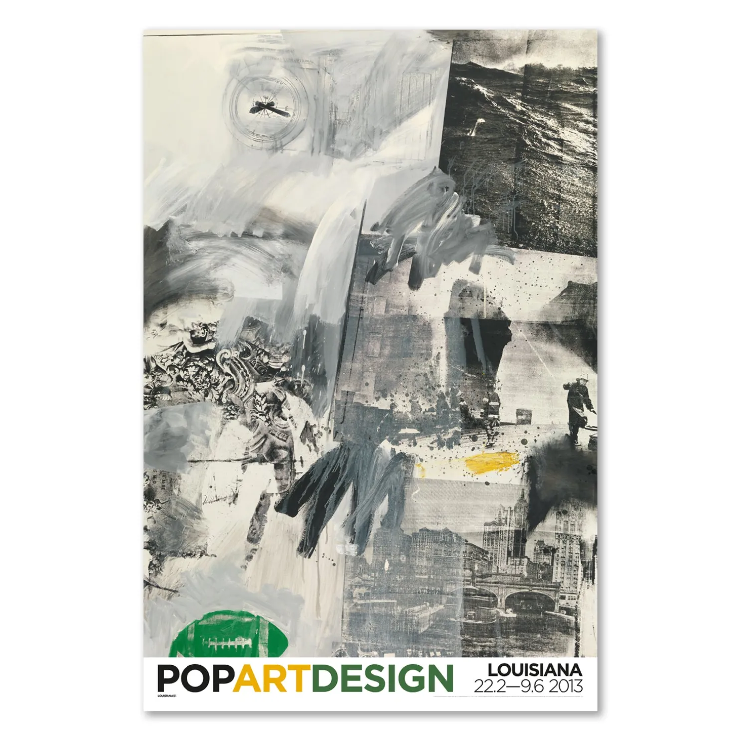 Udstillingsplakat med værket, Tideline, (1963), af den amerikanske kunstner, Robert Rauschenberg (1925-2008), udgivet i forbindelse med Pop Art Design udstillingen på Louisiana i 2013. Rauschenberg er en af vor tids mest betydningsfulde, amerikanske kunstnere og han fik sit kunstneriske gennembrud i midten af 1950’erne med sine såkaldte “combine-paintings” – sammenstillinger af ting og billeder fra den amerikanske storbys virkelighed.