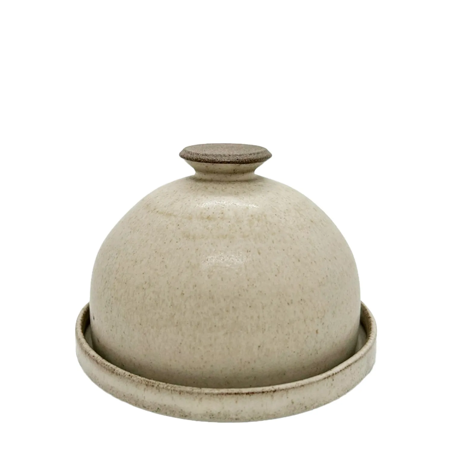 Smørkrukke med kuppellåg fra den danske keramiker Sarah Dannesboe. Smørkrukken er drejet på drejeskive, lavet af gråt stentøjsler med lavapletter. Den er glaseret i en semi-mat havregrynsfarve. Smørret kan enten placeres på skålen, hvor rillerne er designet til at forhindre det i at glide rundt, eller inde i kuplen. Kuppeldelen er med vilje drejet lidt tykkere for at bevare en køligere temperatur fra køleskabet og forhindre smørret i at smelte for hurtigt, når det står på bordet.
