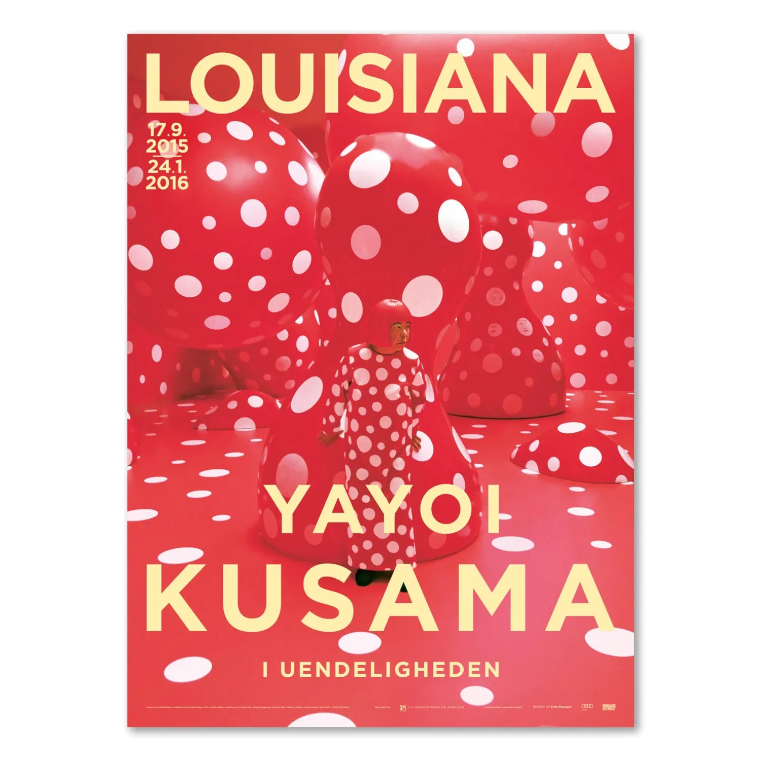 Louisiana plakat med værket, Guidepost to the new space, (2015), af den japanske kunstner, Yayoi Kusama (f. 1929). Præsentationen af Kusamas livsværk på Louisiana, Kusama – i Uendeligheden, i 2016-2017, var den første retrospektive udstilling af kunstnerens værk i Skandinavien, og blev en af de mest besøgte udstillinger i Louisianas historie.