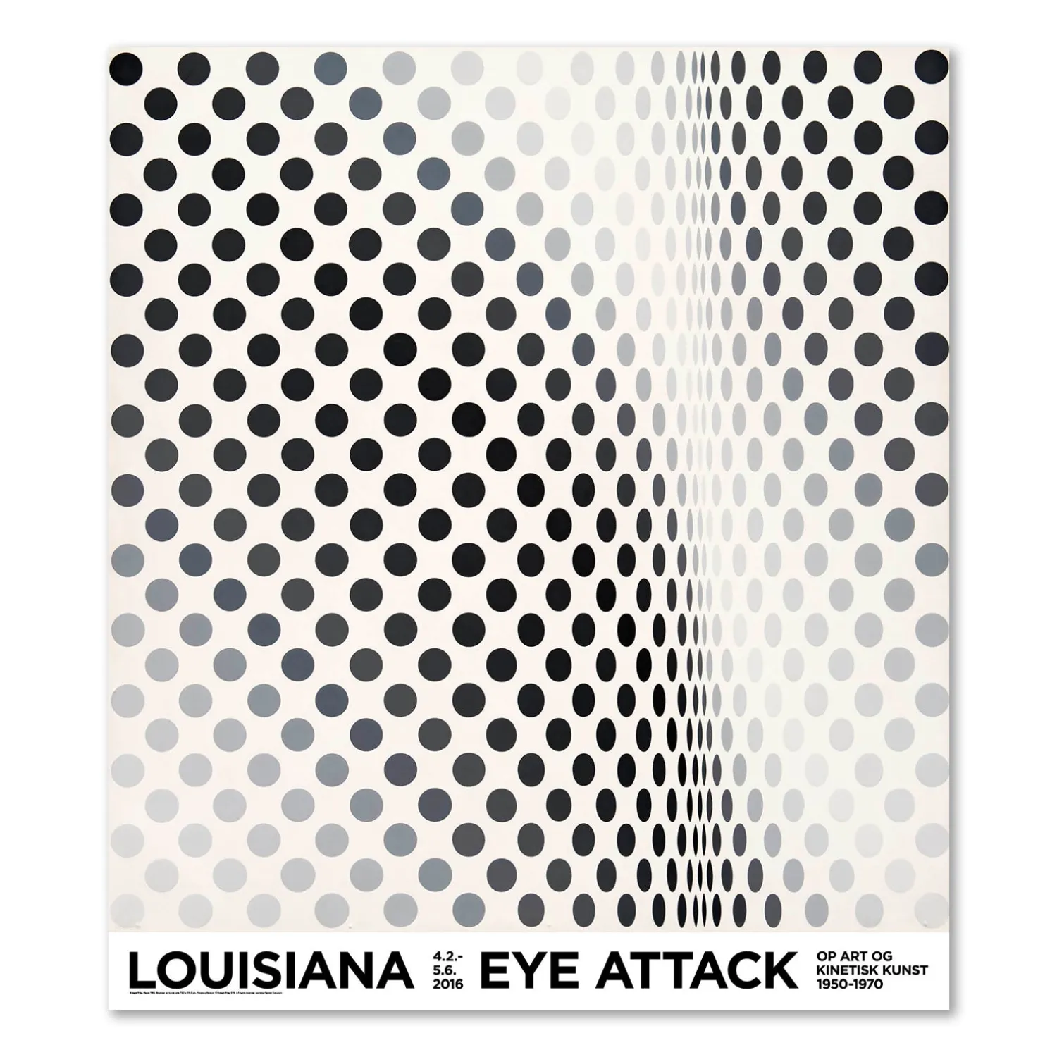 Louisiana plakat med værket, Pause, (1964), af den engelske kunstner, Bridget Riley (f. 1931) fra Louisianas udstilling i 2016, Eye Attack – Op Art og Kinetisk Kunst 1950-1970. Riley var en helt central figur i Op Art strømningen og således også på Louisianas udstilling.