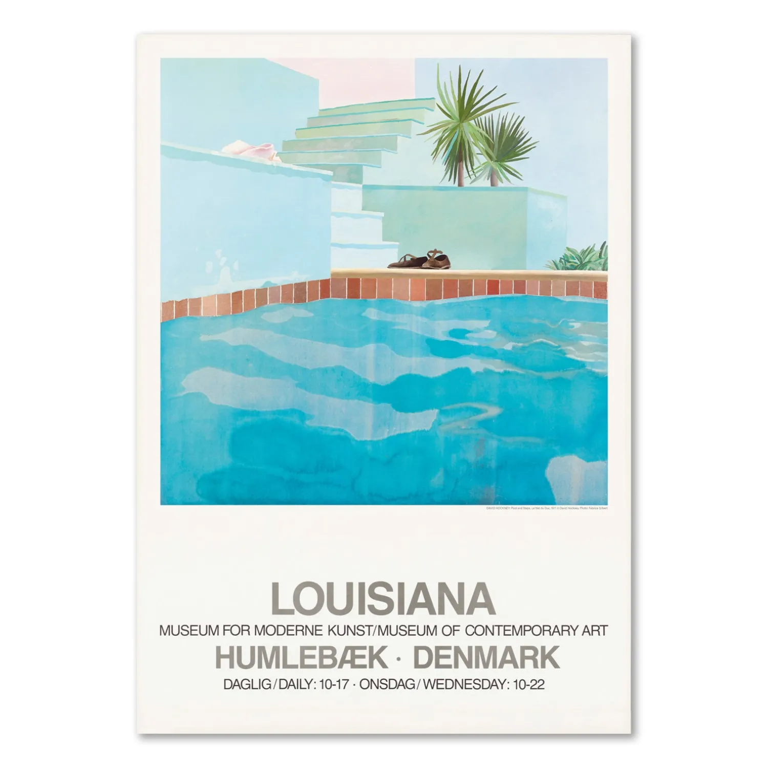 Louisiana-plakat med værket, Pool and Steps, (1971), af den britiske kunstner David Hockney. Hockney er en af Storbritanniens mest indflydelsesrige kunstnere i det 20. århundrede og var central på 60’ernes pop-kunst scene i London. Hockey er særdeles velkendt blandt mange gæster på Louisiana, hvor han har udstillet flere gange.
