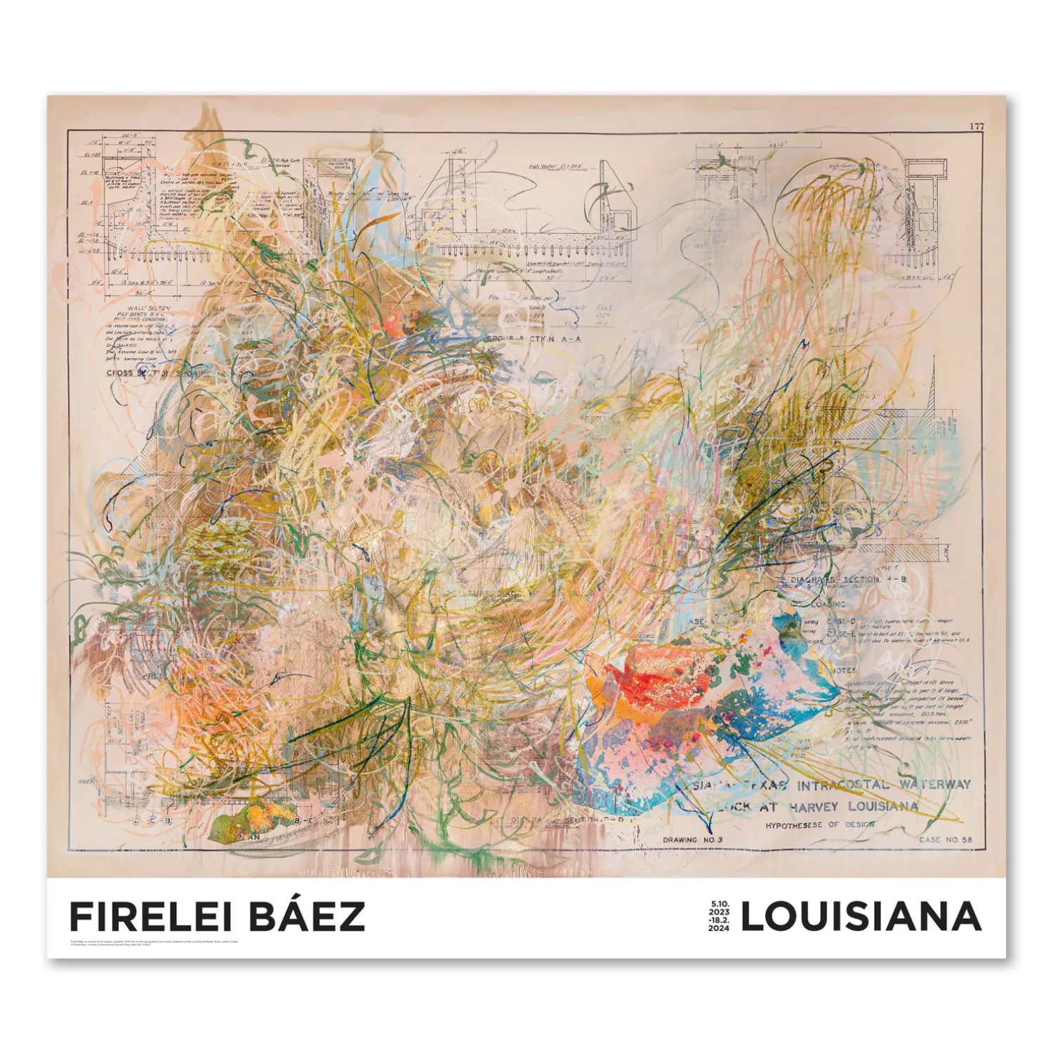 Louisiana Plakat, udgivet I forbindelse med Louisianas udstilling med den den dominikansk-amerikanske kunstner Firelei Báez (f. 1981) – hendes første soloudstilling i Europa. Monumentale malerier og installationer fulde af poesi, smerte og enorm skønhed konfronterer den vestlige verdens hegemoniske magtsprog. Gamle kort, arkitektoniske tegninger og bogsider er de håndgribelige og vitale udgangspunkter for hendes malerier.