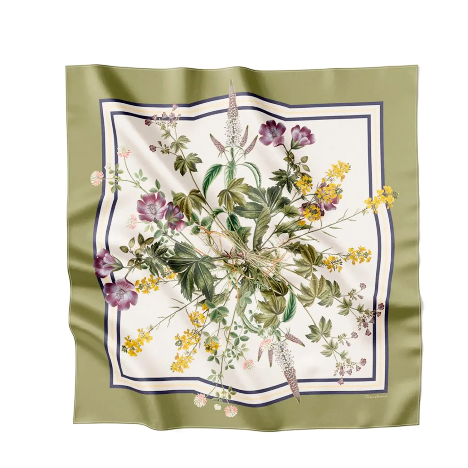 Silketørklæde Green Flora i 100% silk twill fra det danske designbrand Flora Danica. Farverne på Green Flora symboliserer den vilde natur og planter. Silketørklædets motiver er designet ud fra udvalgte Flora Danica blomster, blandet andet illustrationerne af sennep, storkenæb og ærenpris. Coral Flora er designet ud fra udvalgte Flora Danica illustrationer, ærenpris, storkenæb, sennep, skabiose og kløver, der sammen med farverne danner rammen om motivet.