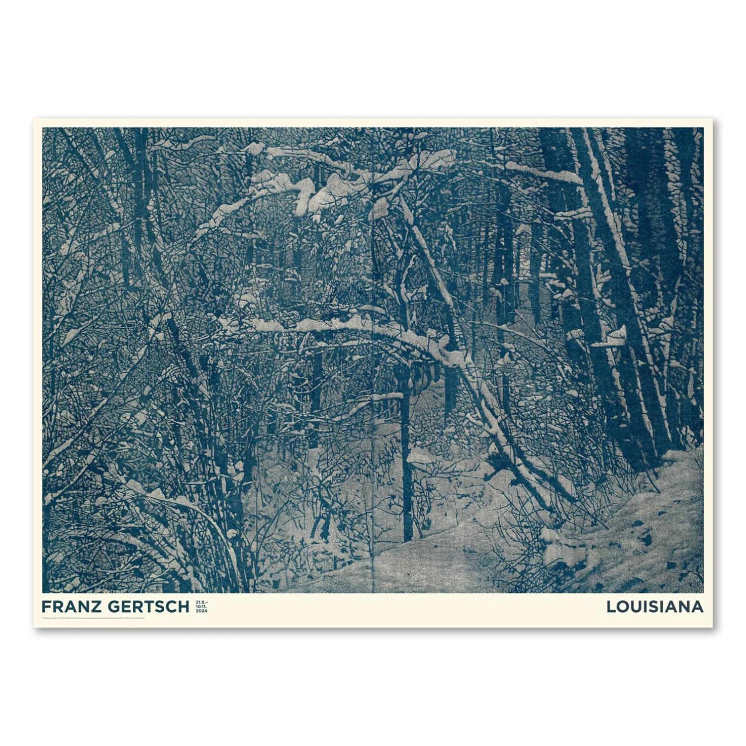 Louisiana plakat med værket Winter (2015-2016), af den schweiziske superrealist Franz Gertsch. Gertsch formede i anden halvdel af det 20. årh. et nyt, særligt realismebegreb og vandt international berømmelse for sine fotorealistiske malerier og træsnit.