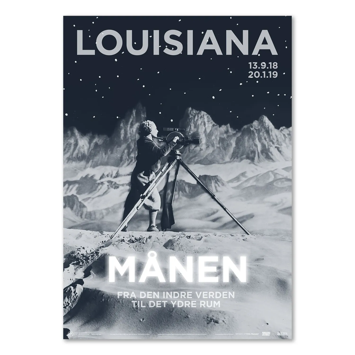 Louisiana plakat med værket, Frau im Mond, (1929), af den østrigsk-amerikanske filminstruktør, Fritz Lang (1809-1976). Billedet på plakaten er fra Langs science fiction film om en rejse til månen og plakaten blev udgivet i forbindelse med Louisianas udstilling i 2018, Månen – Fra den indre verden til det ydre Rum.