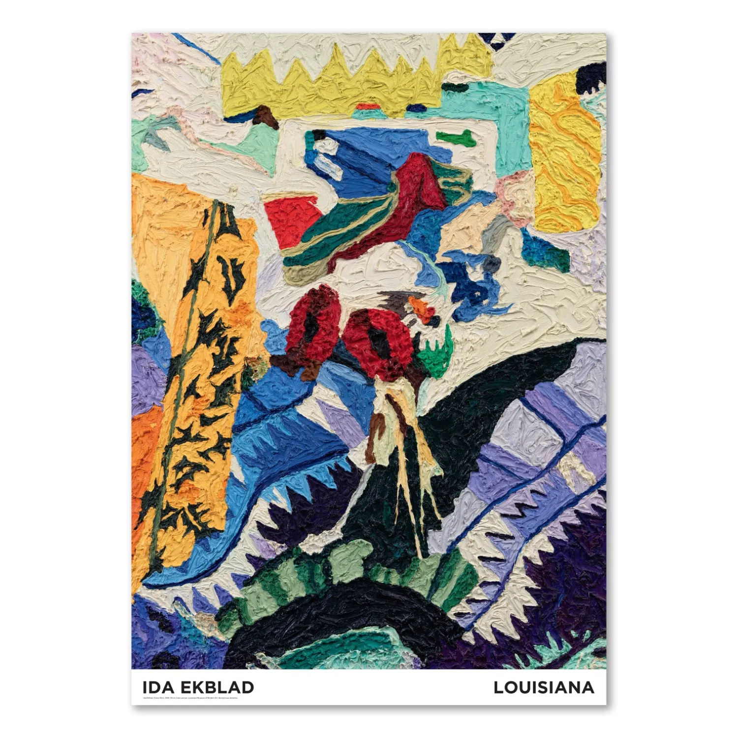 Louisiana plakat med værket, Ocean Girls, (2020), af den norske kunstner, Ida Ekblad (f. 1980). Oceans Girls byder på en markant stoflig tilstedeværelse i farve og form, som det er nærmest modelleret kraftigt op i maling. Som om Ekblad vil fortælle, at et billede også kan være en ting – og i det her tilfælde netop vældigt fysisk tungt i kraft af Ekblads bevidste brug af meget materiale. Ocean Girls indgår i Louisianas samling.