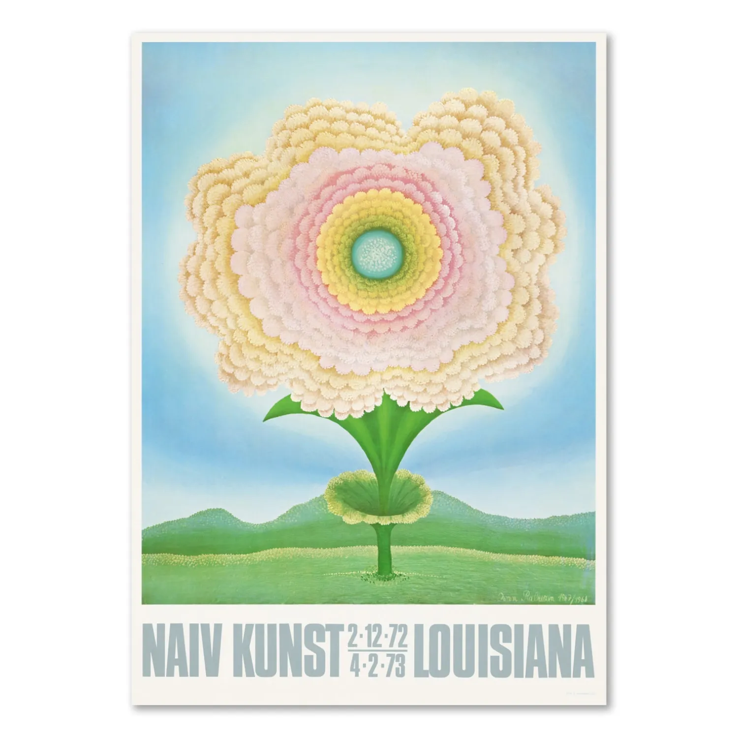 Udstillingsplakat med værket, Hiroshimas blomst, (1968), skabt af den kroatiske kunstner, Ivan Rabuzin, i forbindelse med gruppeudstillingen, Naiv kunst, på Louisiana i 1972.