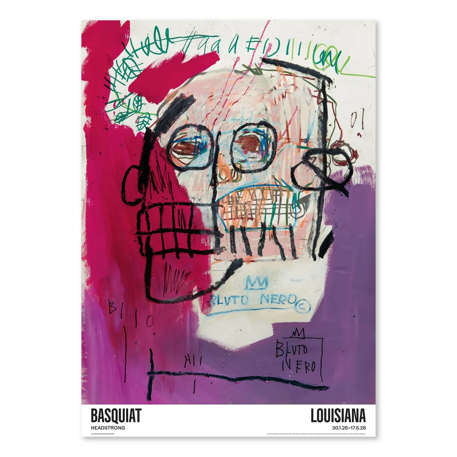 Louisiana Plakat med værket, Untitled (Bluto Nero), 1982 af den amerikanske kunstner Jean-Michel Basquiat (1960-1988), udgivet i forbindelse med udstillingen ‘Basquiat – Headstrong’. Dette er den første større udstilling, der fokuserer på Basquiats afbildninger af det menneskelige hoved – et felt, der står centralt i hans virke.