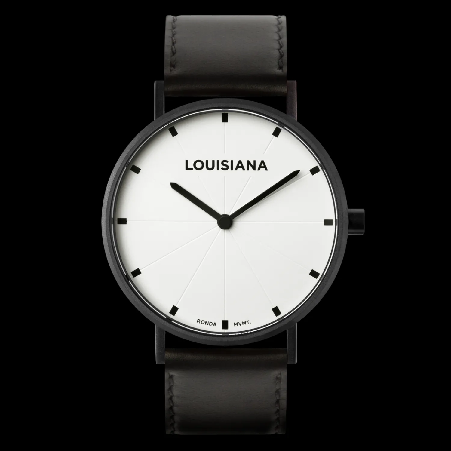 16 mm bred urrem i sort læder, som passer til det Louisiana uret, hvor urskiven er 37 mm i diameter. Uret er designet i et samarbejde mellem Louisiana og det danske designbrand Larsen & Eriksen. Uret er inspireret af de rene linjer og geometriske former, som kendetegner Louisianas arkitektur.