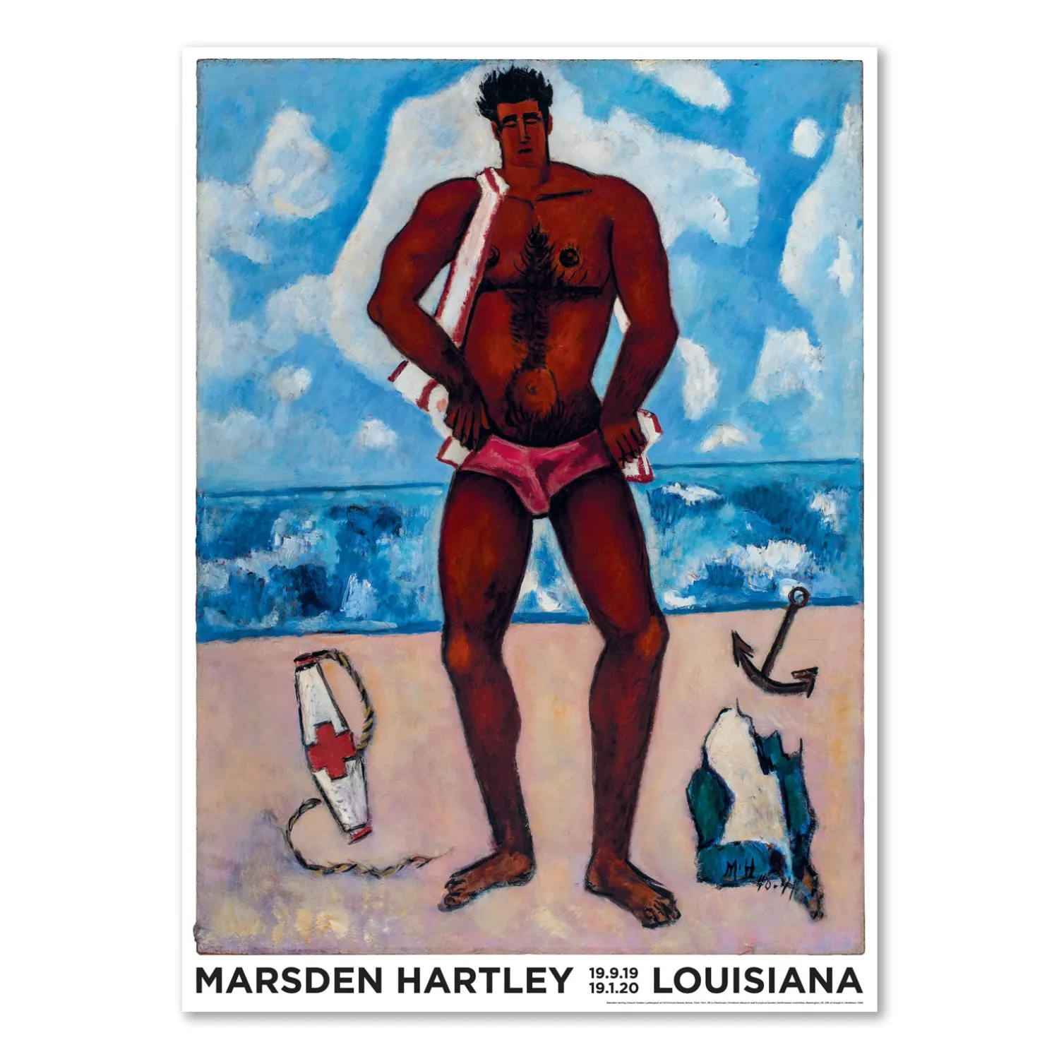 Louisiana Plakat med værk af den amerikanske kunstner,Marsden Hartley (1877-1943), Canuck Yankee Lumberjack at old Orchard Beach, Maine, (1940-41). Selv om Marsden Hartley kaldes for “Amerikas første store moderne maler i det 20 århundrede”, har hans originale værk længe været overset. Louisiana præsenterede ham i 2019 på den første retrospektive udstilling i Europa i godt 60 år.