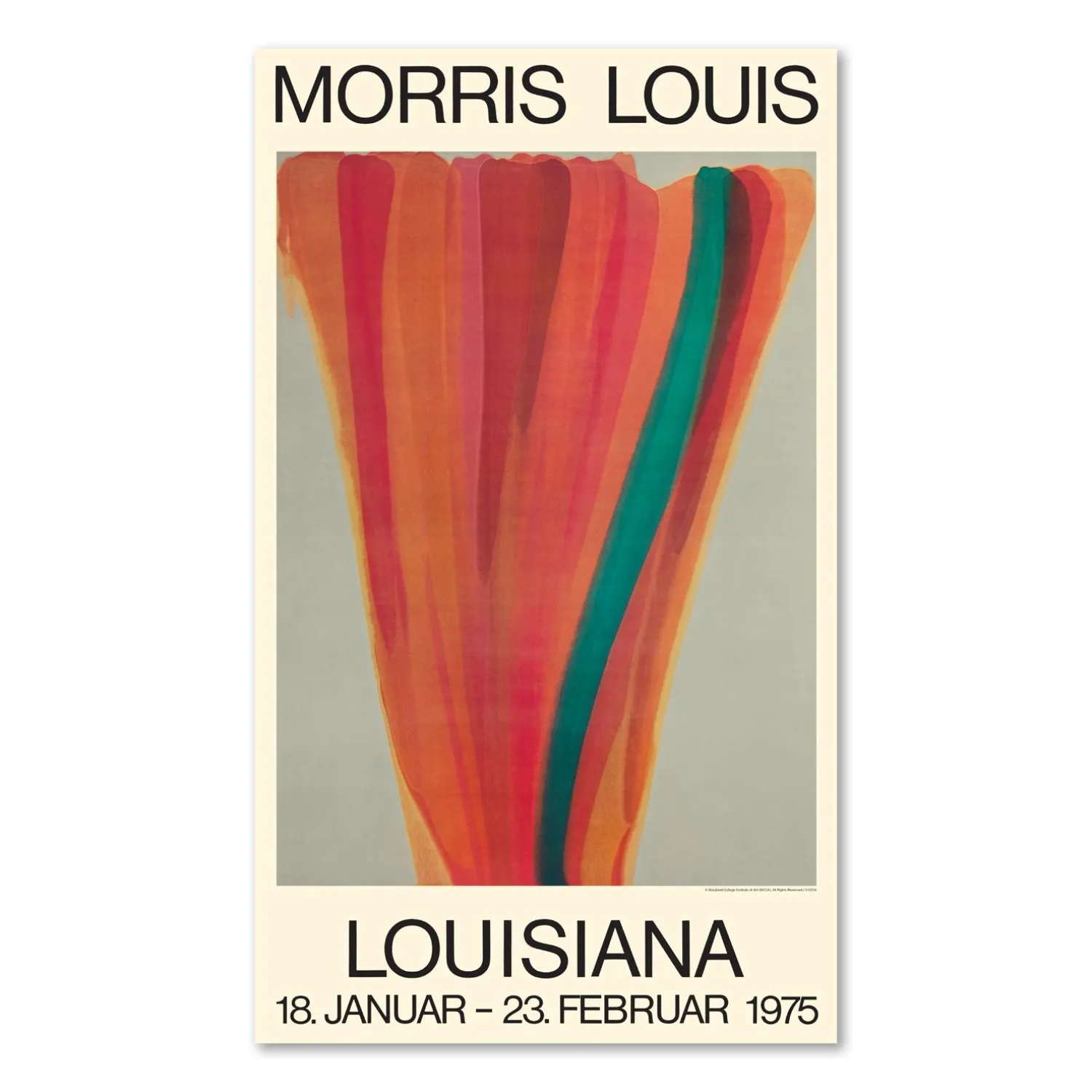 Louisiana udstillingsplakat plakat med værk af den amerikanske kunstner, Morris Louis, (1912-62). Morris Louis tilhørte den nye generation af ‘colorfield-malere’, der gjorde sig gældende i New York efter 2. Verdenskrig. Louisiana modtog flere værker som gave fra Louis’ enke, Marcella Louis Brenner, efter en udstilling på museet i 1975.