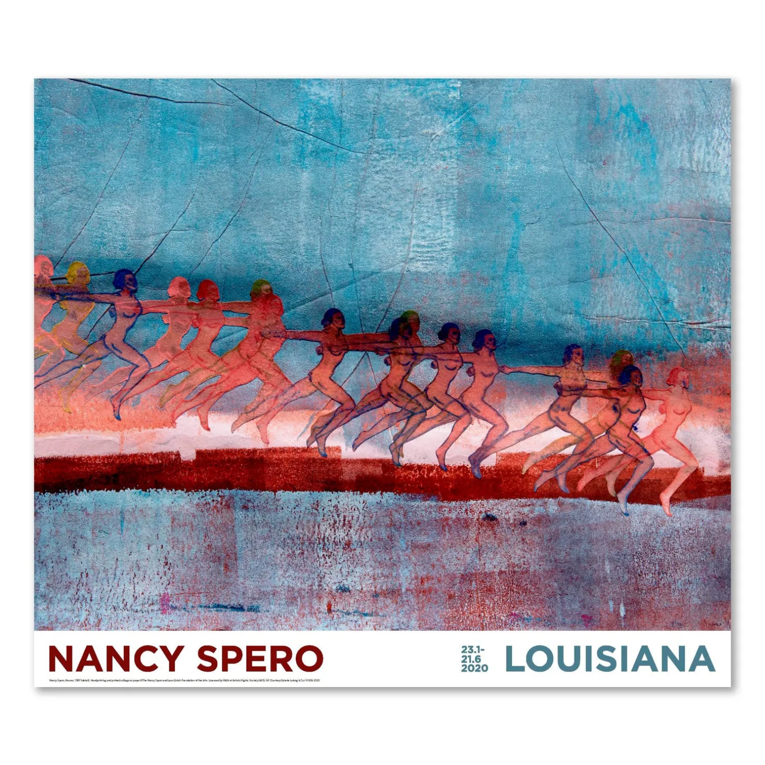 Udstillingsplakat med værket, Runner, (1997), af den amerikanske kunstner, Nancy Spero, (1926-2009), udgivet i forbindelse med udstillingen på Louisiana i 2020. Nancy Spero var aktivist og feministisk pioner og kendt for sit kunstneriske opgør med 1960’ernes magthavere af enhver slags. Nancy Speros værker er en del af Louisianas samling.