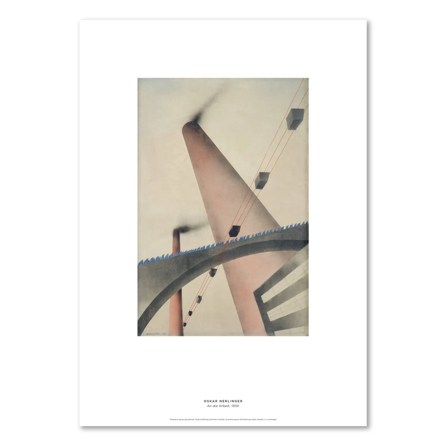 Louisiana print med værket, An die Arbeit – Til arbejdet, (1930), af den tyske kunstner, Oskar Nerlinger, (1893-1969). Plakaten er udgivet i 2022 i forbindelse med Louisianas udstilling om Tyskland i 1920’erne, Det kolde Øje. Nerlingers værk er et af mange udtryk for den nøgterne skildring af fattige arbejderes hverdag på kapitalismens bagside, som var i fokus hos nogle af kunstnerne i 1920’ernes tyske, kunstneriske bevægelse – Neue Sachlichkeit – den nye objektivitet.