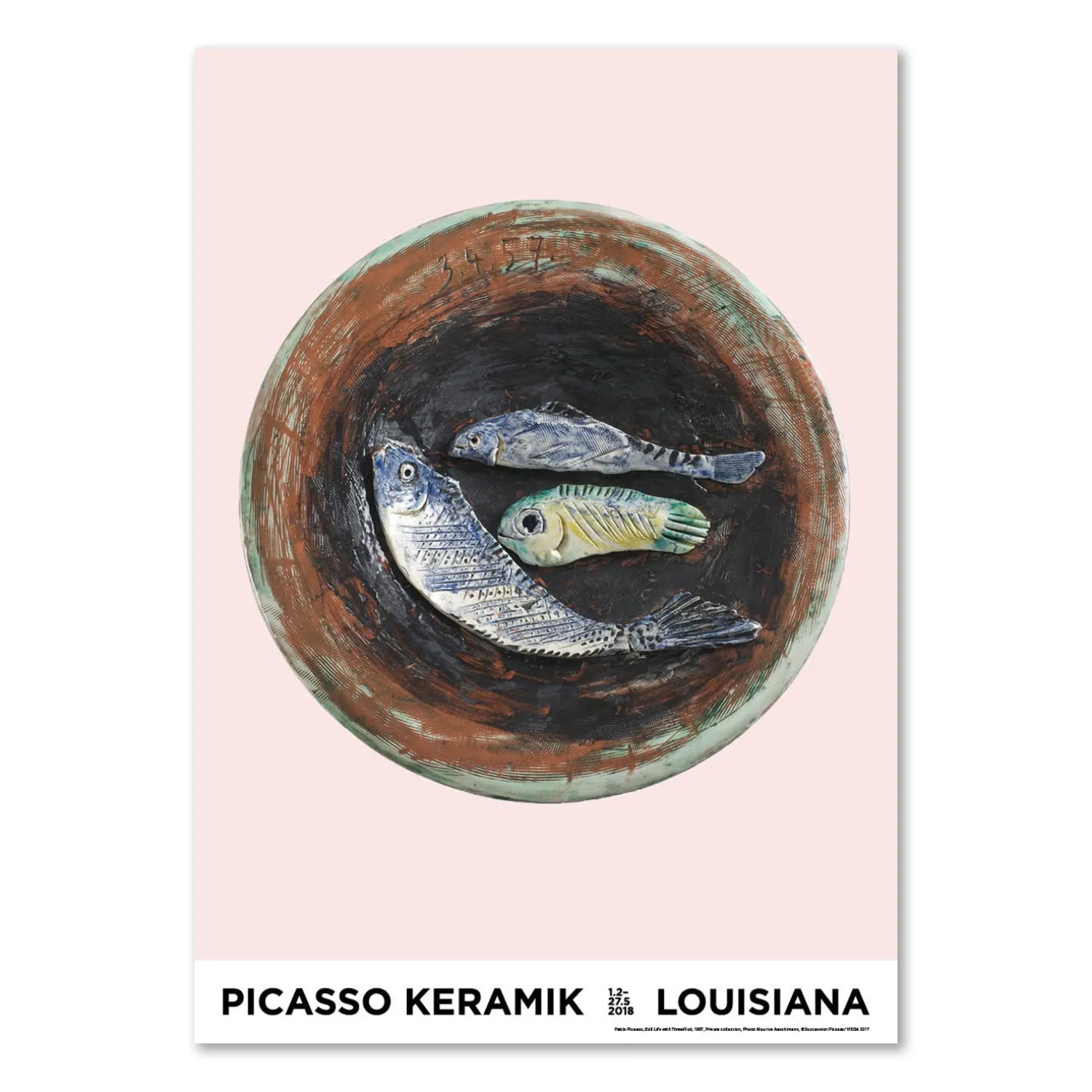 Louisiana plakat med værket, Still-life with three fish, (1957), af den spanske kunstner, Pablo Picasso (1881-1973). Plakaten blev trykt i forbindelse med den store udstilling, Picasso Keramik, på Louisiana i foråret 2018, som markerede begyndelsen på Louisianas 60 års jubilæumsår.