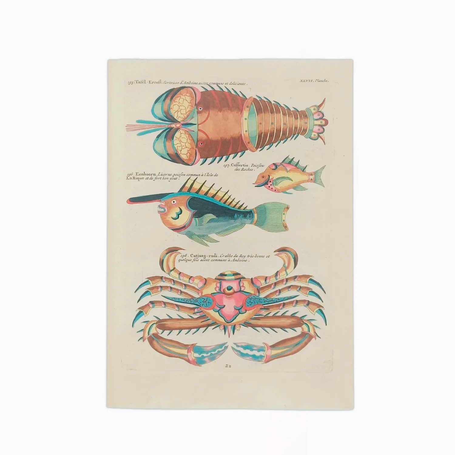 Postkort med motiv fra bogværket Poisson, ecrevisses et crabes de diverses couleurs et figures exrtaordinaire, que l’on trouve autour des isles Moluques et sur les côtes des terres Australes, (1754), af Louis Renard, udgivet i forbindelse med udstillingen HAVET i efteråret 2024.