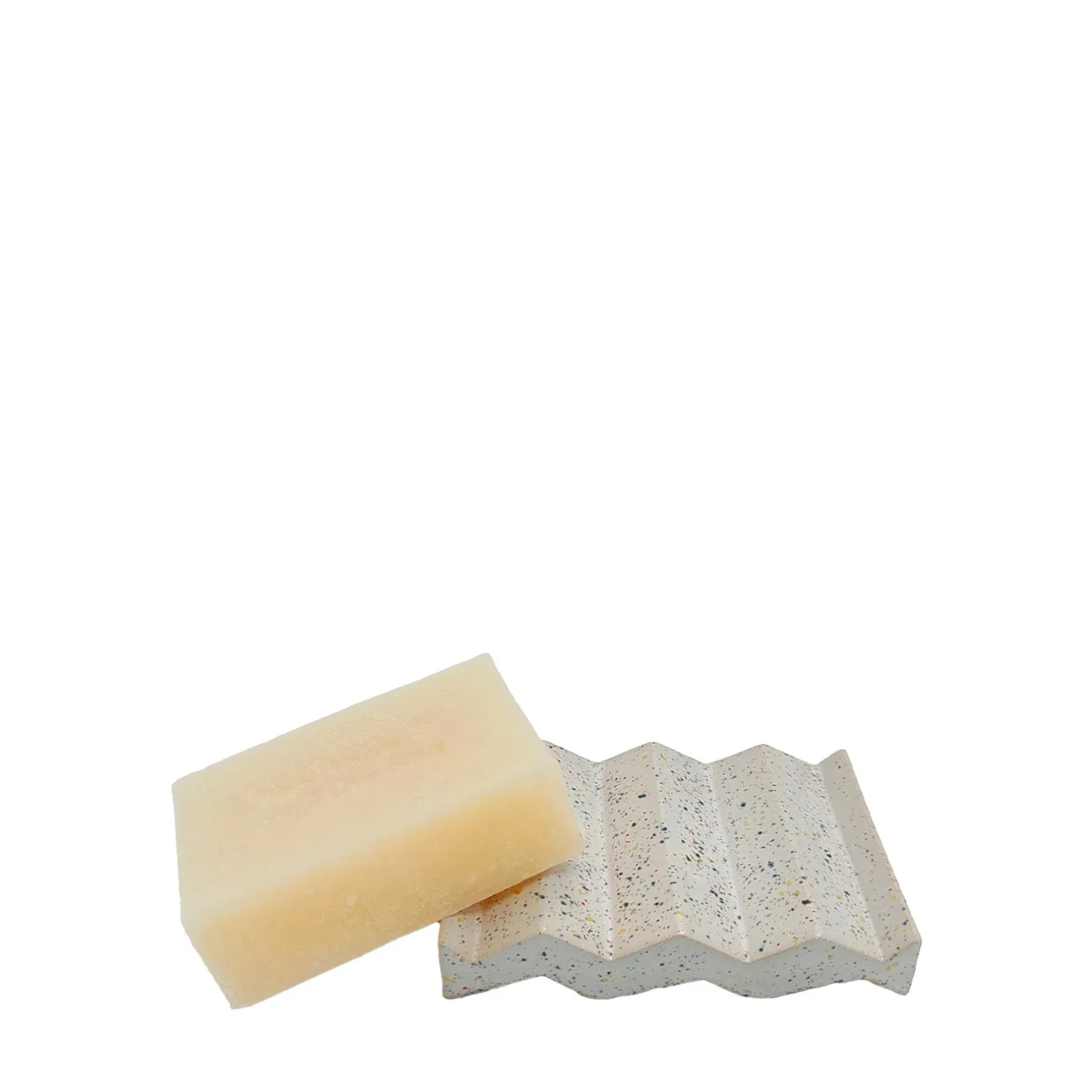 Sæbe og stentøjssæbeskål fra spanske Soap and the Sea. Sættet inkluderer en økologisk sæbe, Cedar & Sandalwood , som kommer i en æske dekoreret med illustrationer af den franske kunstner Jean Jullien. Sæben er parret med en stentøjssæbeskål, Confetti, designet i Berlin af Barbara fra OBA Studios og håndlavet i Christophorus-værkstedet for handicappede i Fürstenwalde, Tyskland.