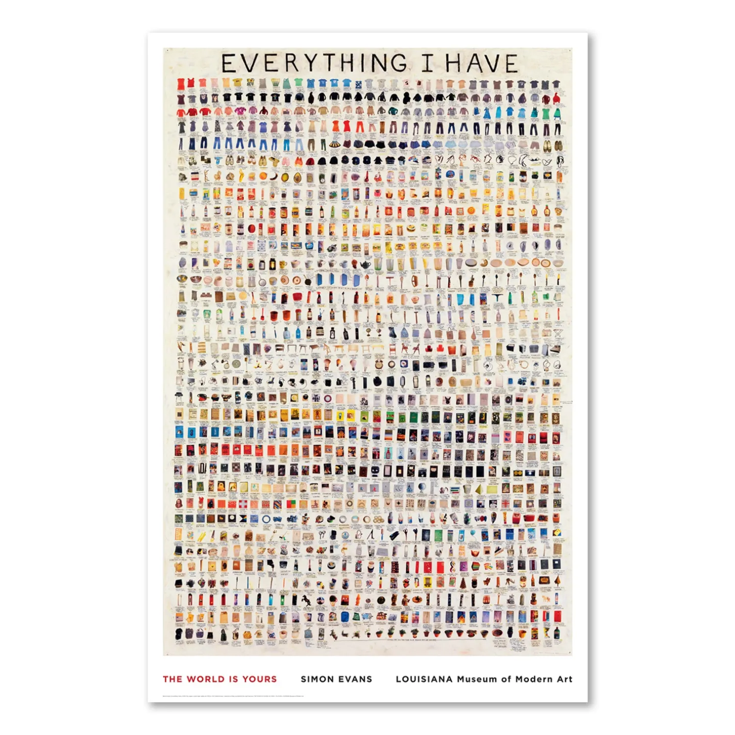 Louisiana plakat med værket, Everything I Have, (2008), af den britiske kunstner, Simon Evans, (f. 1972). Her kortlægger Evans alt, hvad han ejer, gennem mere end tusind små illustrationer af sine ejendele. Plakaten blev trykt i forbindelse med Louisianas store, internationale samtidskunstudstilling, The World is Yours, i 2009.