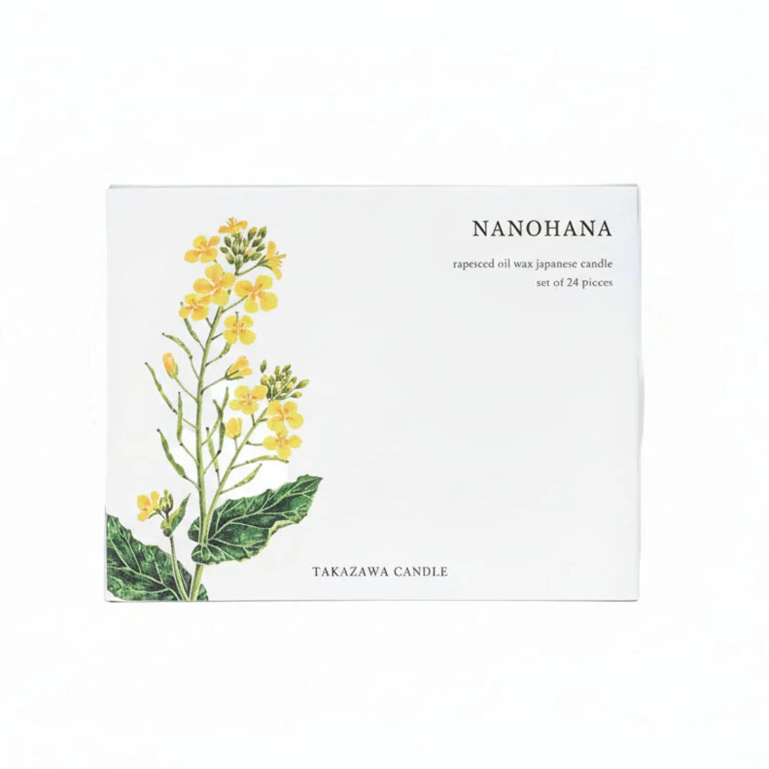 Håndlavet stearinlys, Nanohana, fra det japanske designbrand Takazawa. Lyset er lavet af rapsolie, inspireret af de gule rapsblomster, der markerer Noto-øen. Når søfolk ser blomsterne, ved de, at de snart når øen. Lysene har en tyk, hul væge af snoet washi-papir, siv og silkefibre, der sikrer en stærk og stabil flamme.
